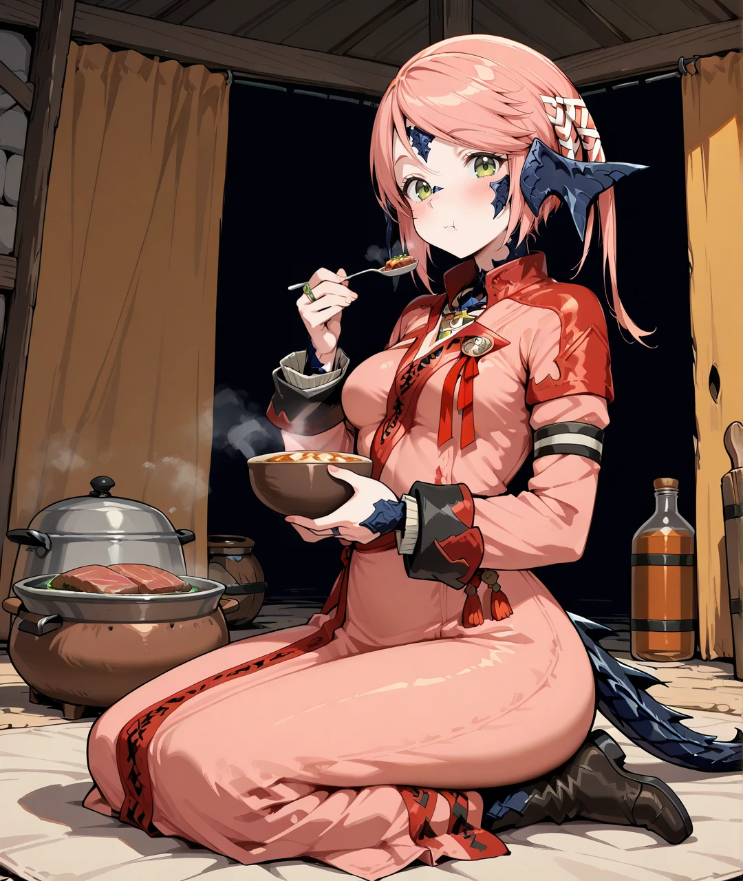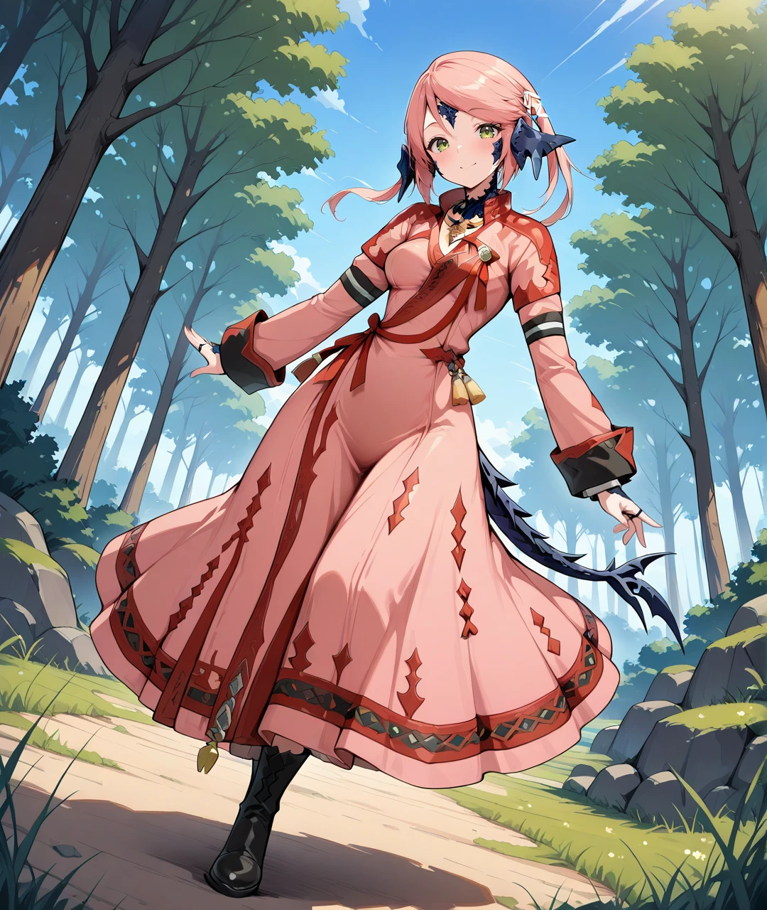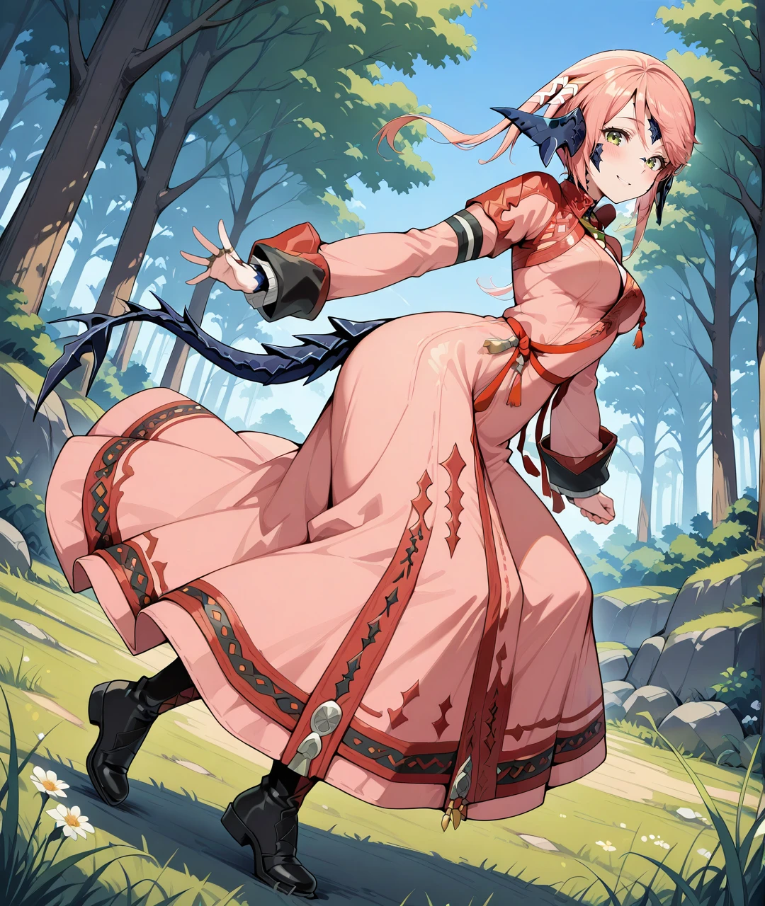 Tags: CirinaBase, au ra, black dragon horns, black scales, black dragon tail, green eyes, pink hair, long hair, hair tubes, white hairband, hair between eyes, necklace, jewelry, medium breasts, two-tone dress, pink dress, red dress, long dress, long sleeves, wide sleeves, ring, black boots,