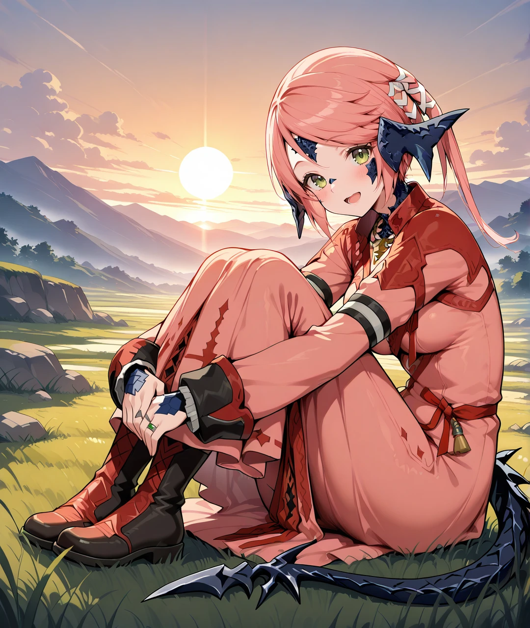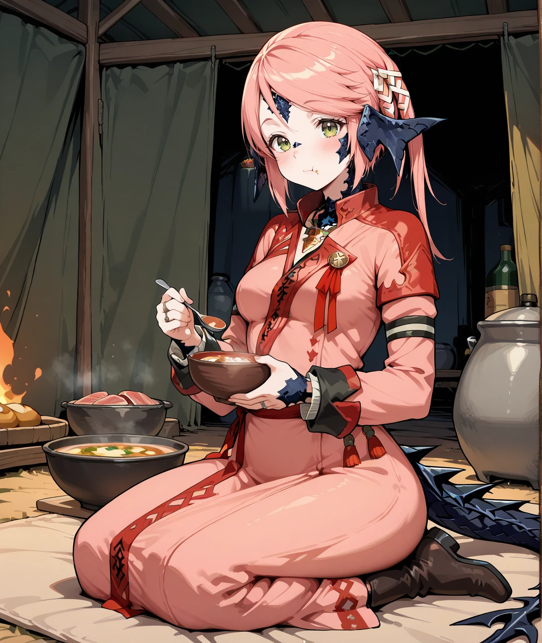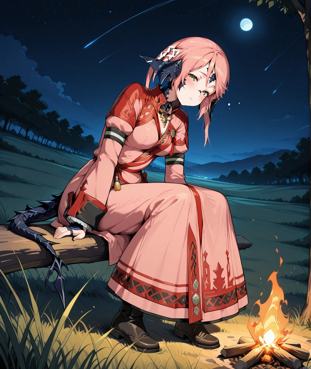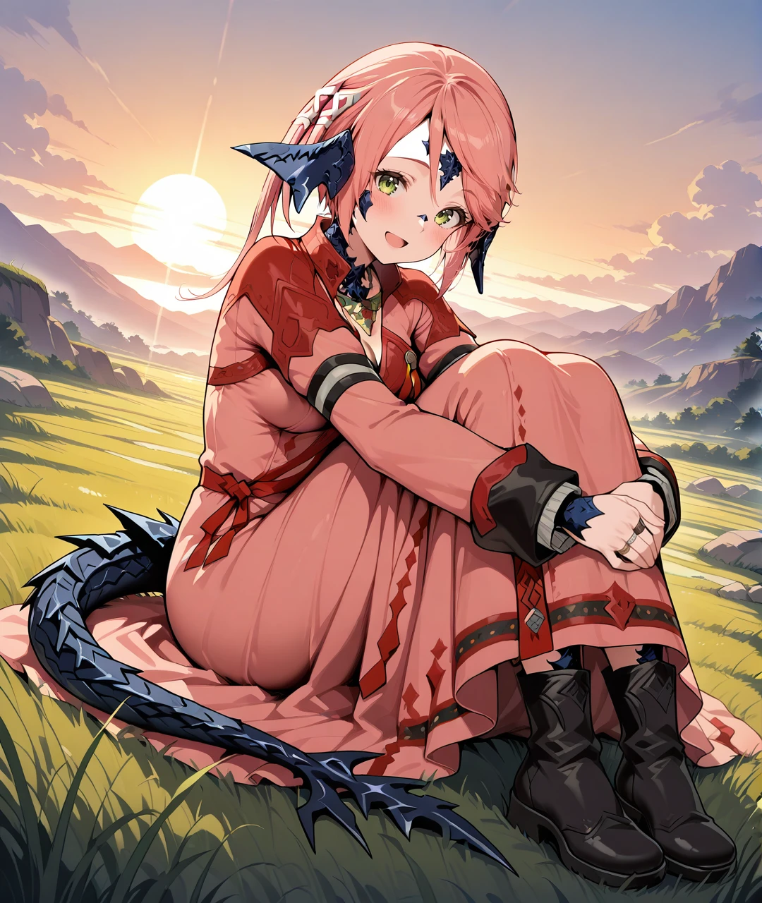 Tags: CirinaBase, au ra, black dragon horns, black scales, black dragon tail, green eyes, pink hair, long hair, hair tubes, white hairband, hair between eyes, necklace, jewelry, medium breasts, two-tone dress, pink dress, red dress, long dress, long sleeves, wide sleeves, ring, black boots,