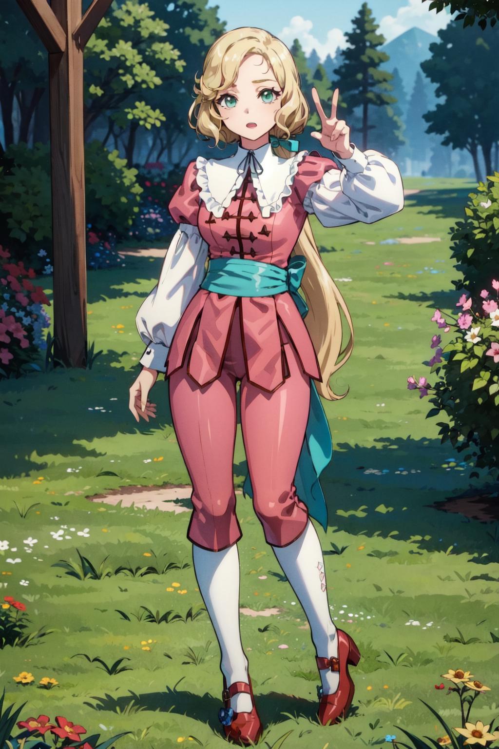 The outfit is: pink pants, pink shirt, white detached collar,green sash,white kneehighs, red shoes,puffy long sleeves.
