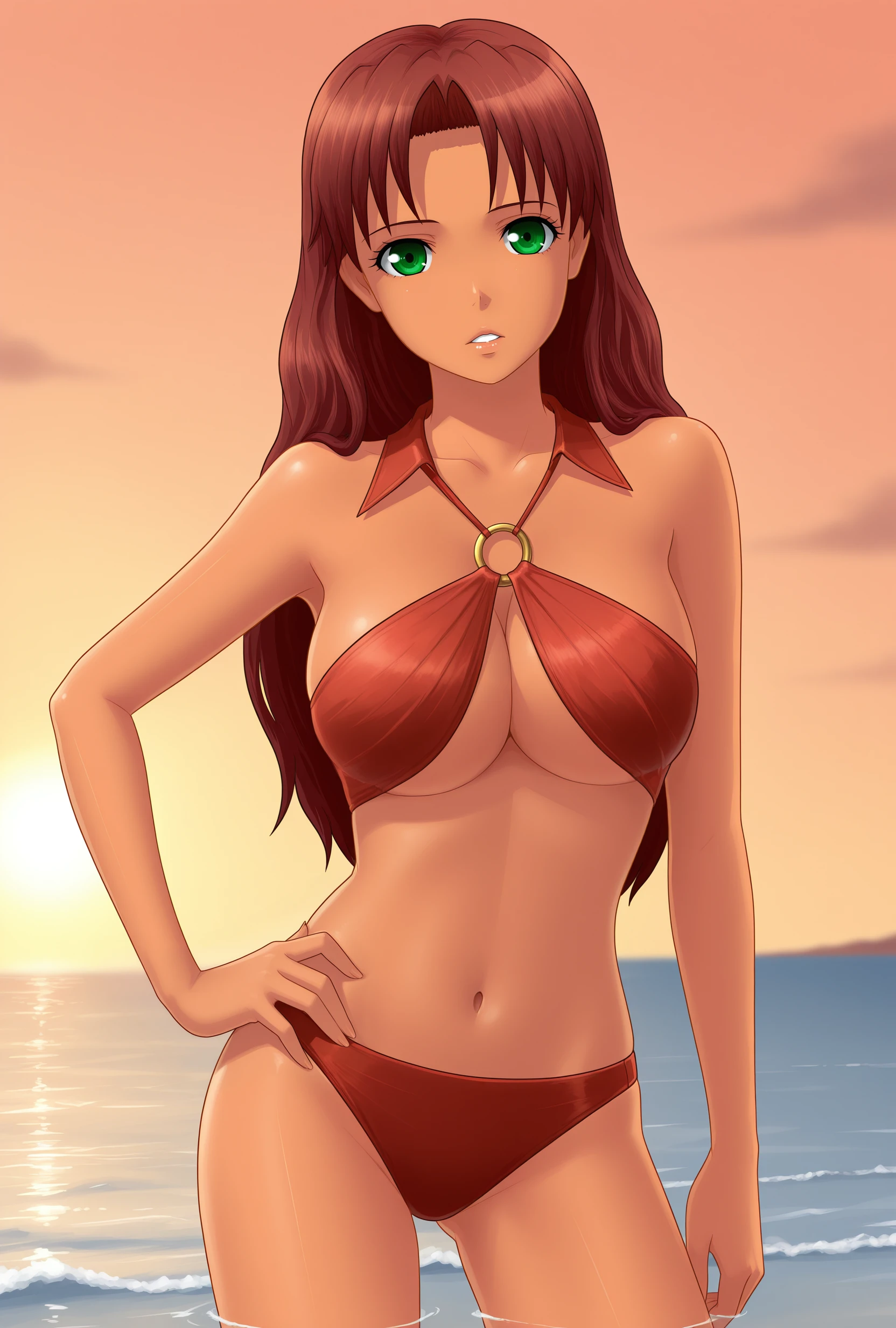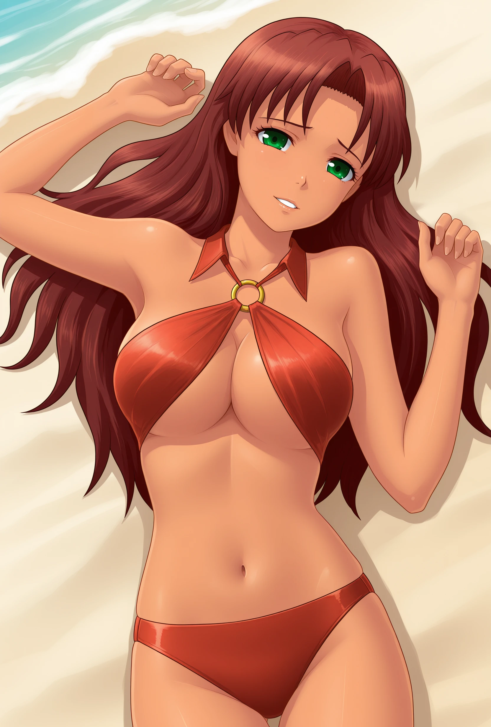 red_bikini, halterneck, collared_bikini, criss-cross_halter, o-ring_top, underboobHires. fix: Hires steps 20;