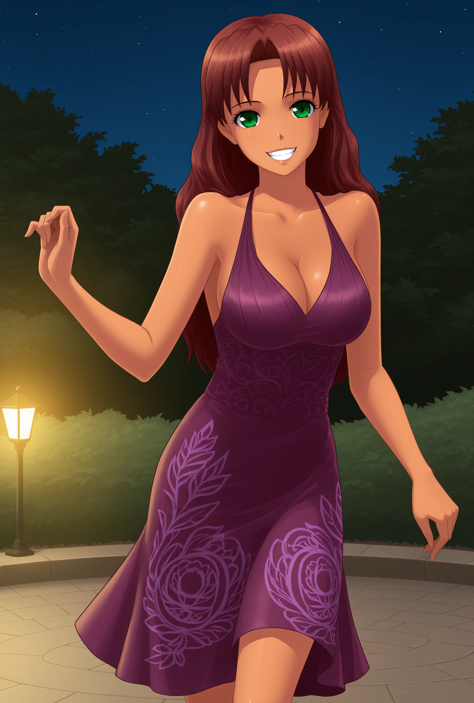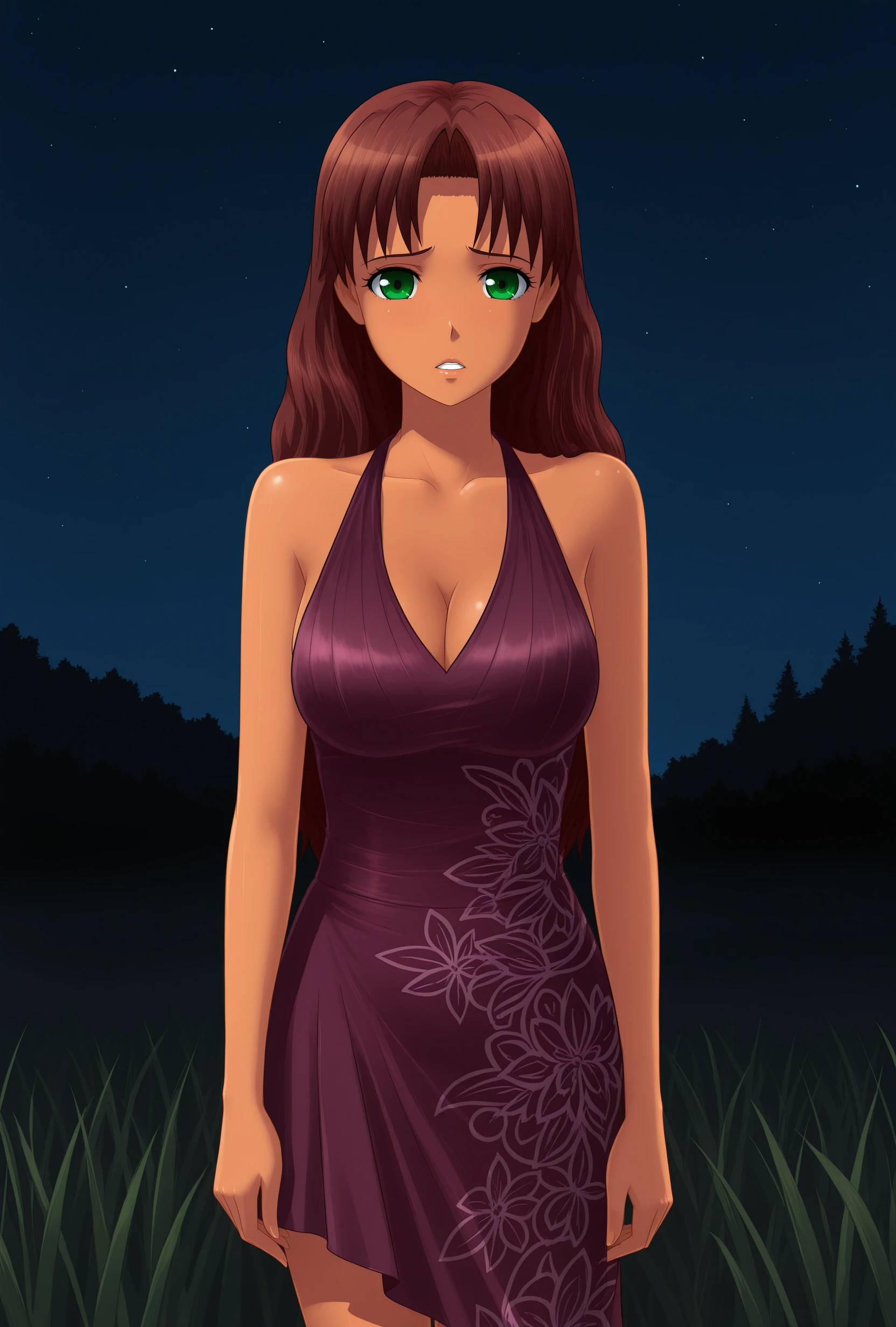 Olga, mature_female, brown_hair, long_hair, parted_bangs, green_eyes, dark_skin
