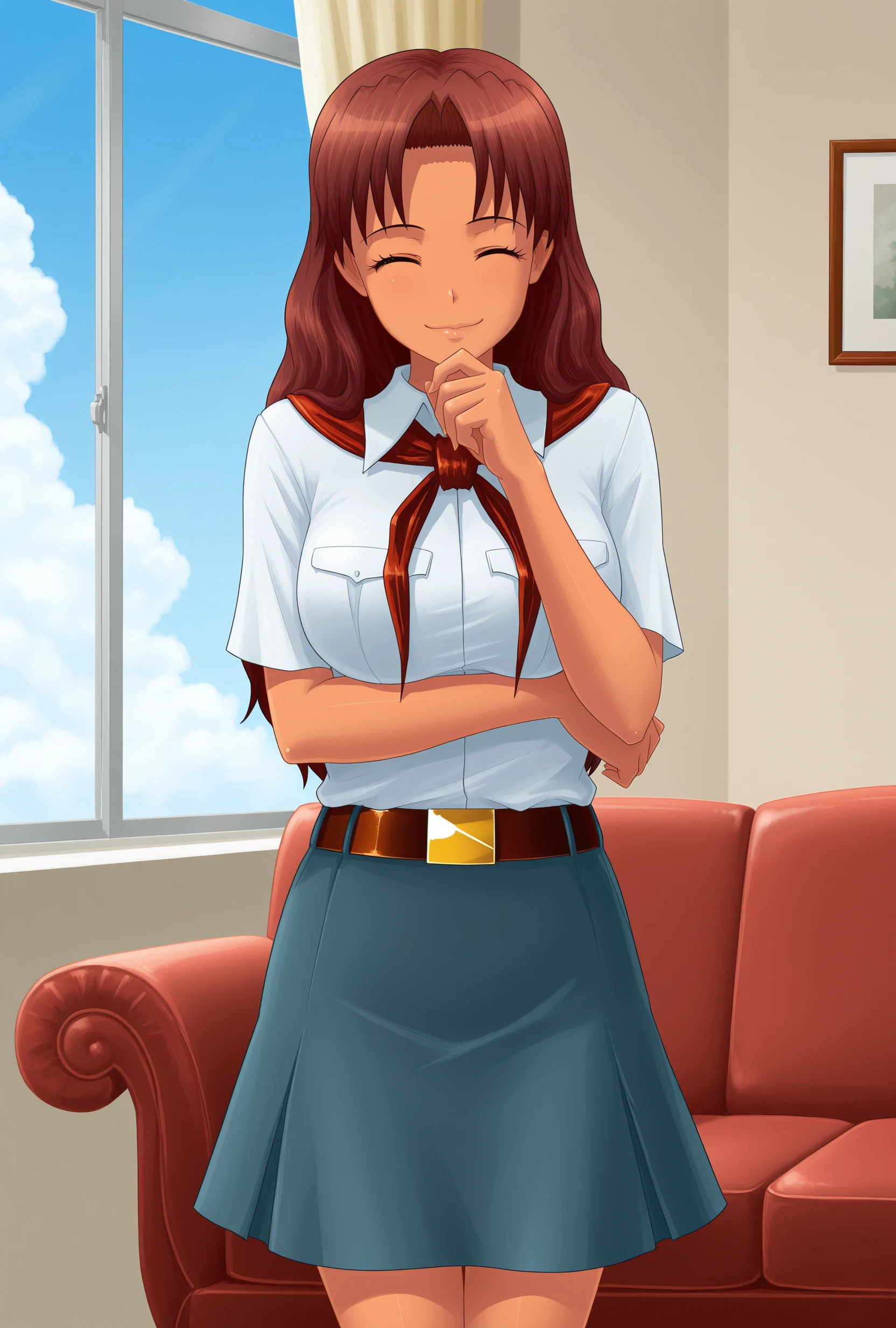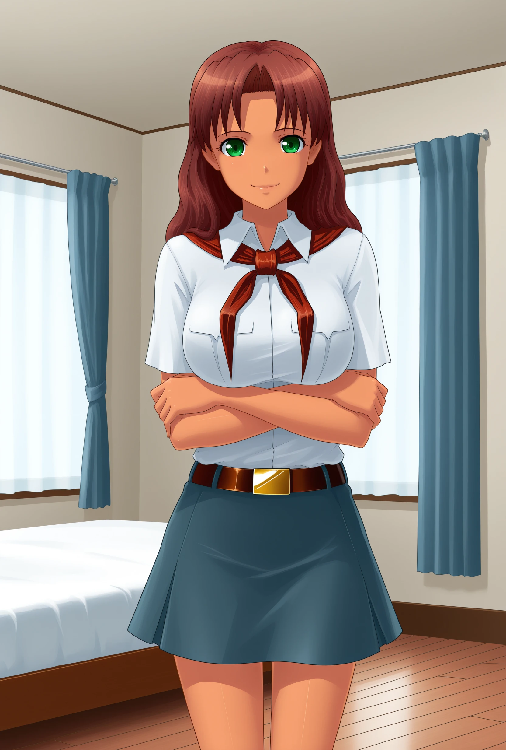 white_shirt, collared_shirt, short_sleeves, pioneer_neckerchief, brown_belt, brass_buckle, dark_blue_skirt