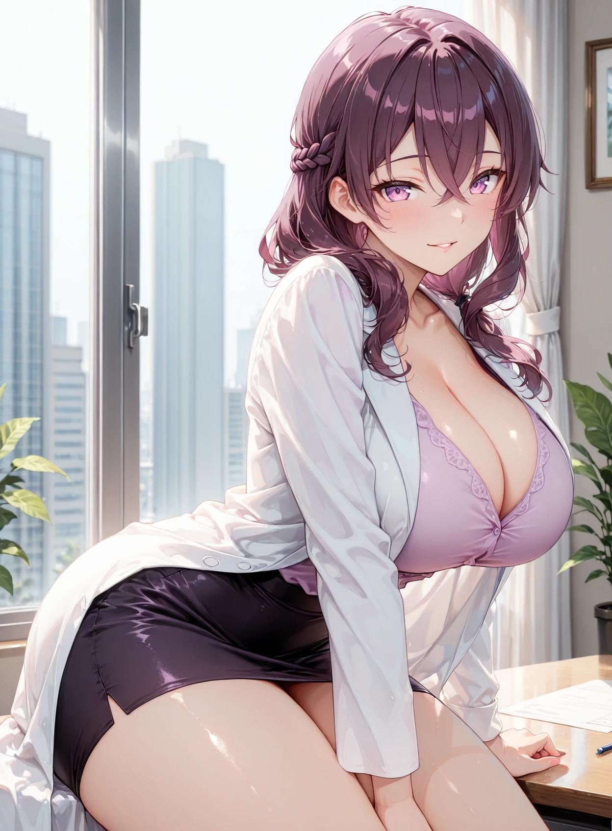 additonal triggers include: ichiyo_sugami, purple eyes, crossed bangs, side braid, purple hair, wavy hair, hair over shoulder