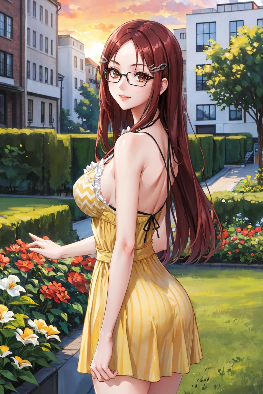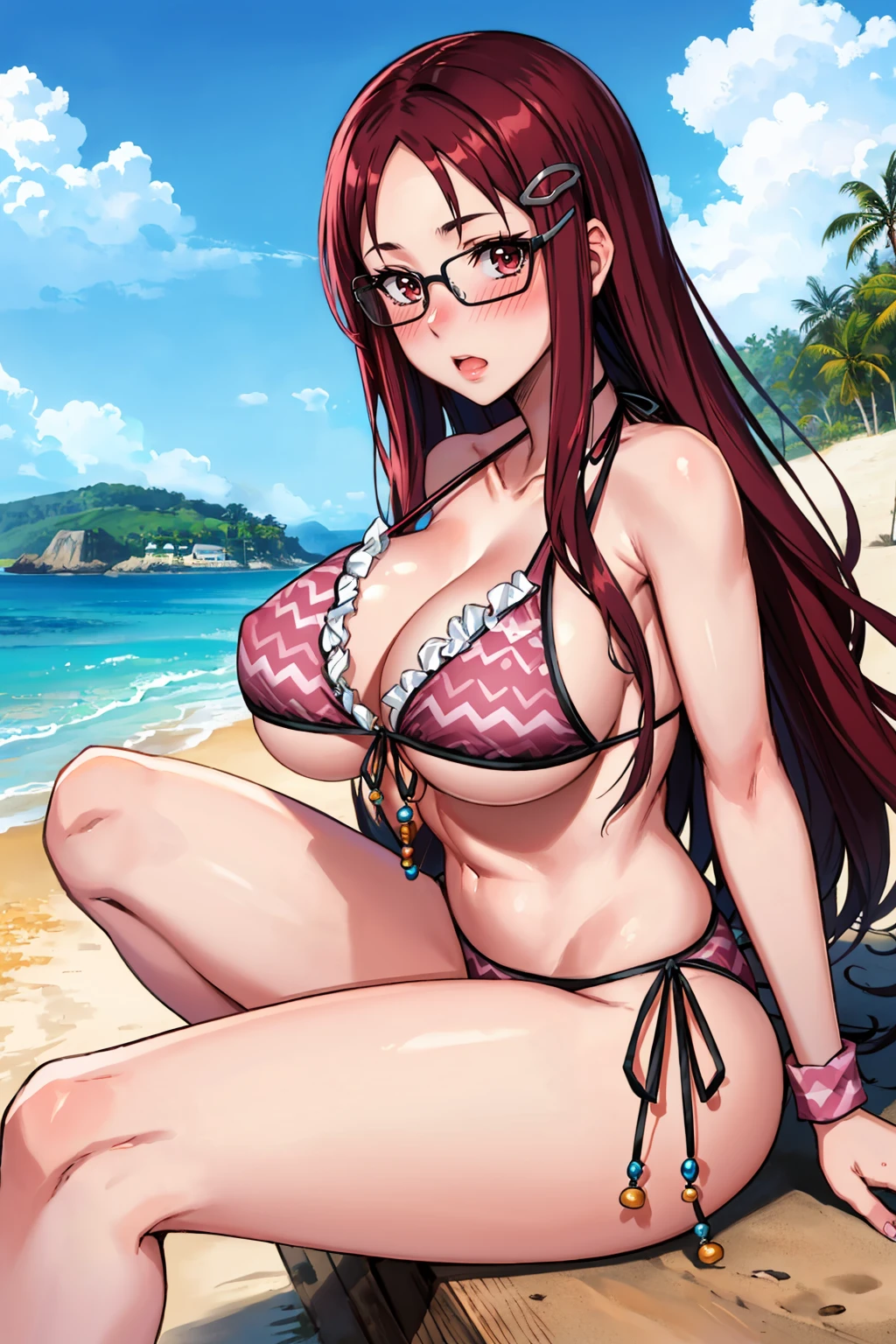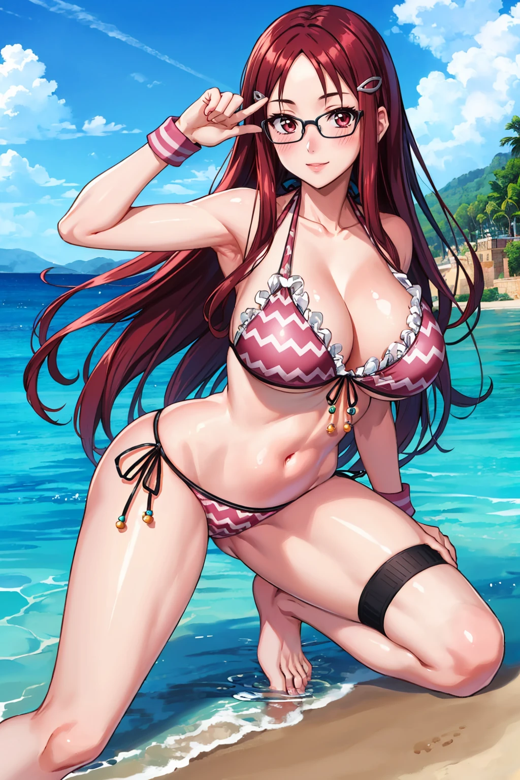 Add "hairclip, glasses, pink bikini, frills, side-tie bikini bottom, wristband, knee pad" for her swimsuit.