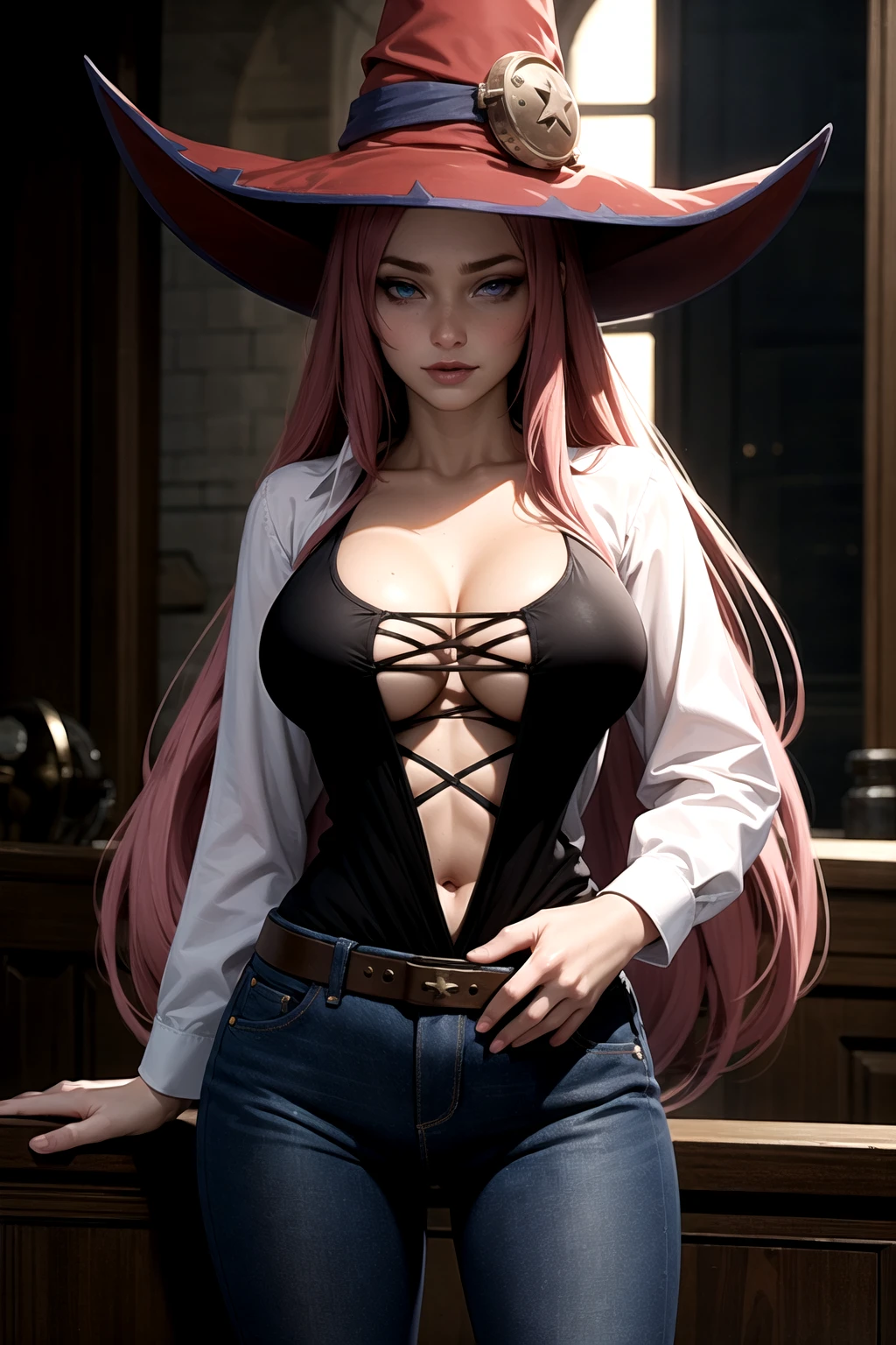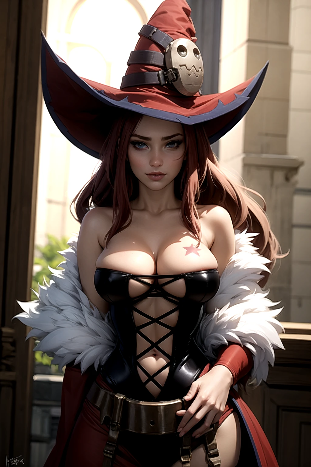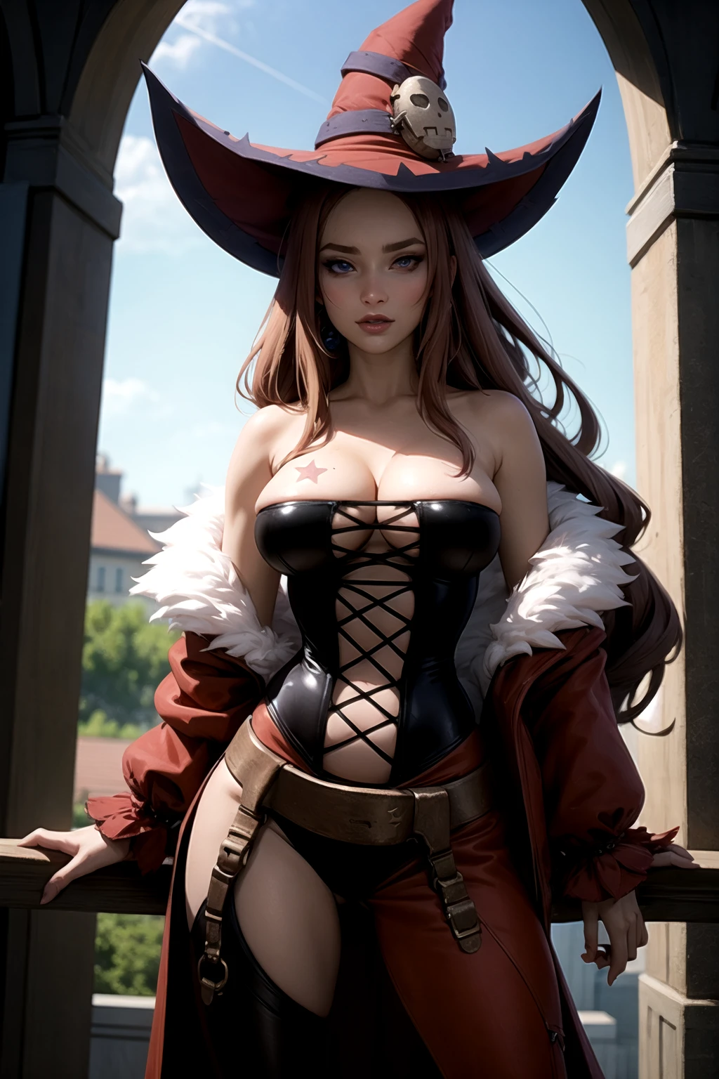 Basic Prompt: vanessa_\(luminous_arc\), long_hair, heterochromia, boob_star, witch_hat, corset, jacket, cleavage