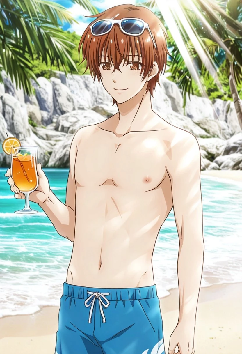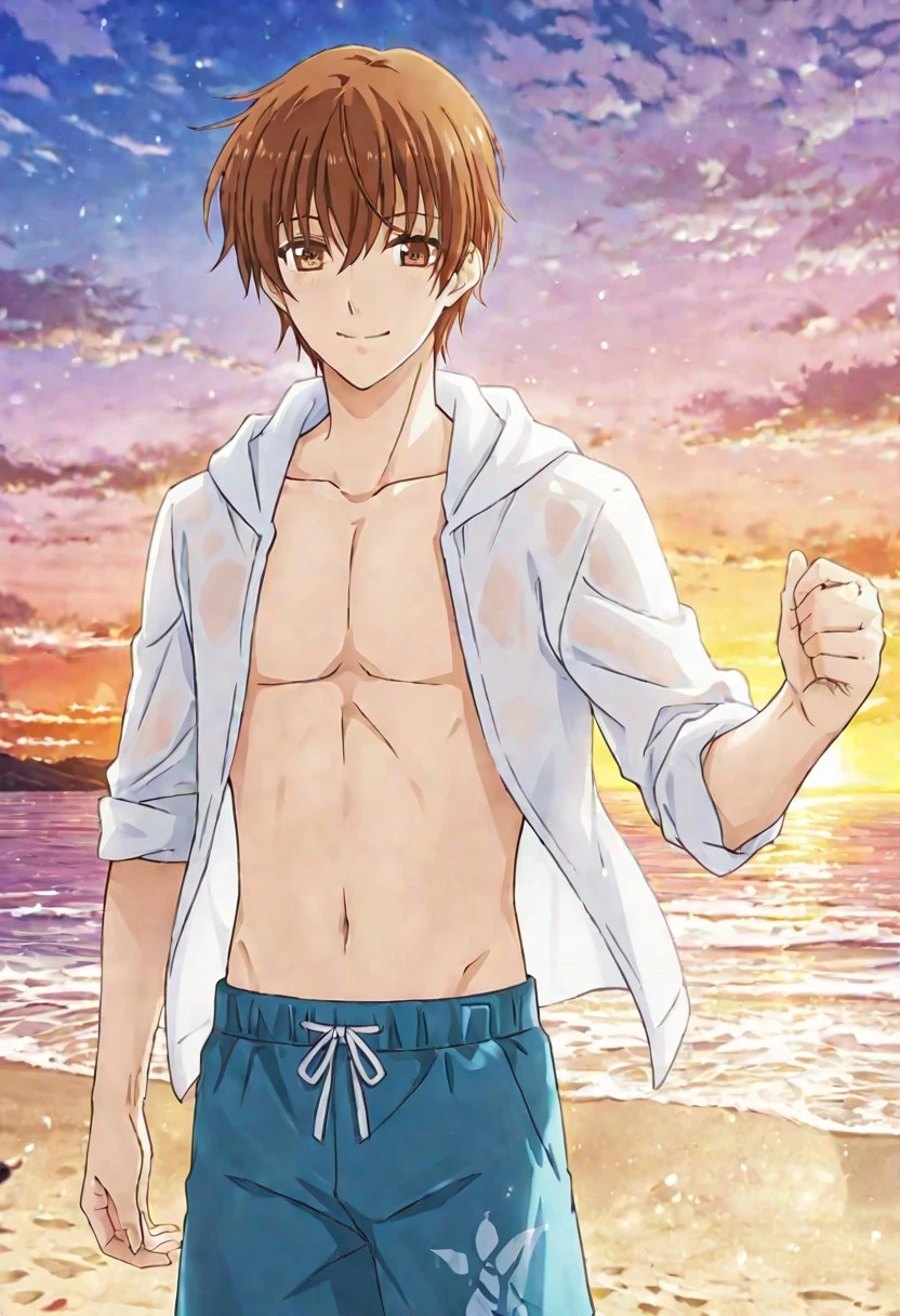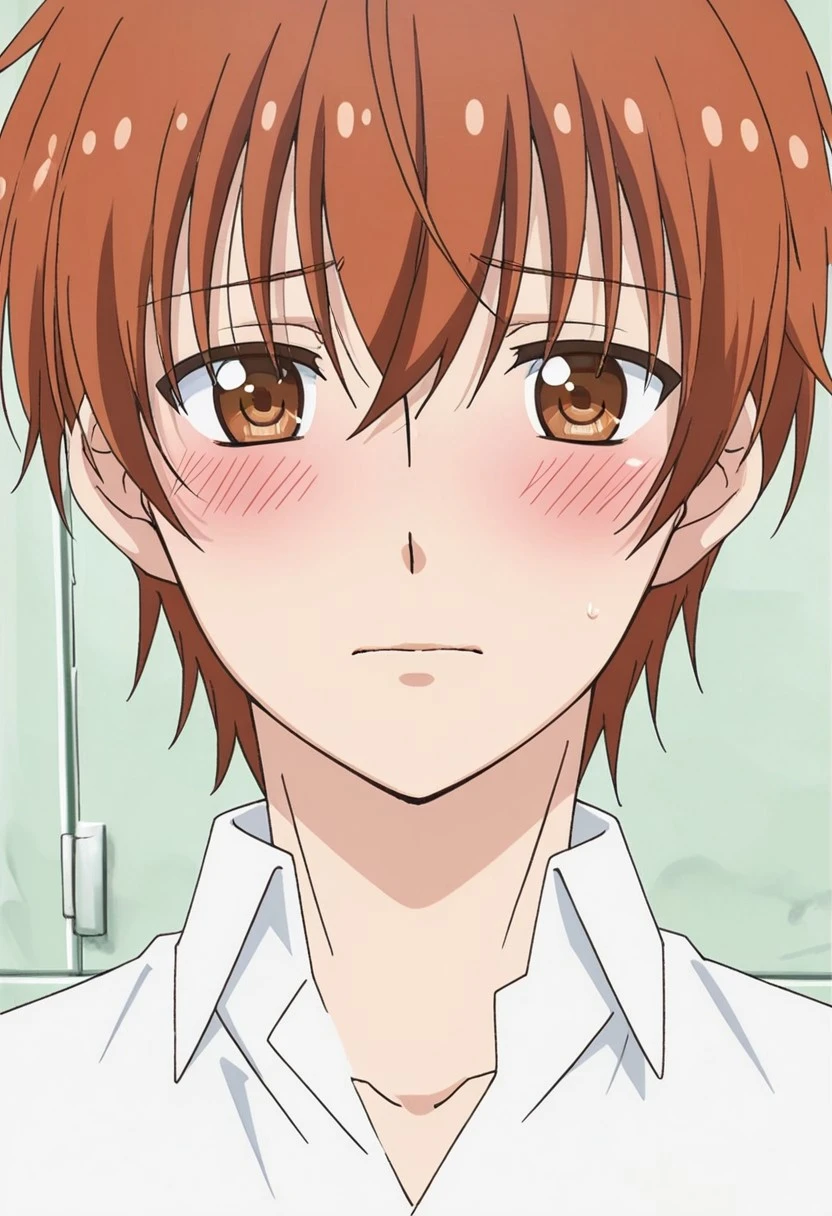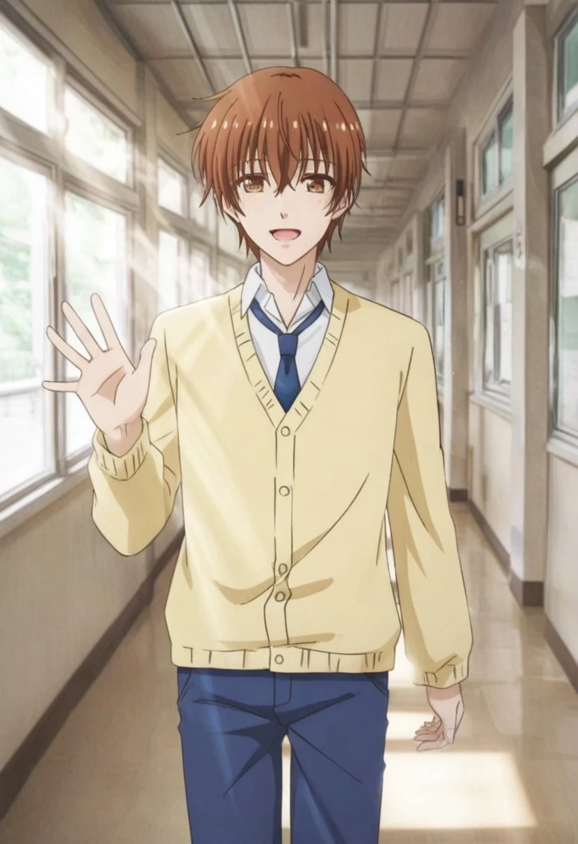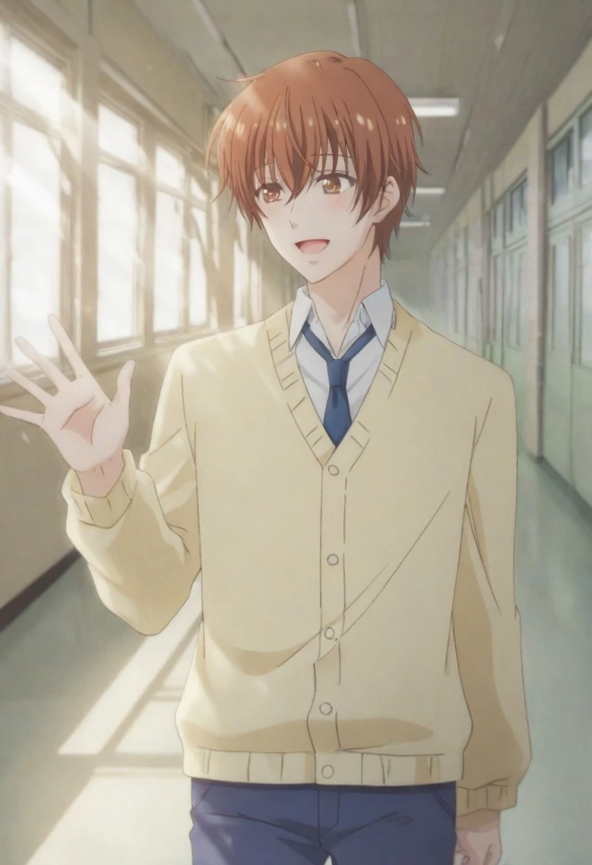 Takumi Kijima, brown-orange hair, brown-orange eyes, yellow cardigan, white collared undershirt, blue necktie, blue pants