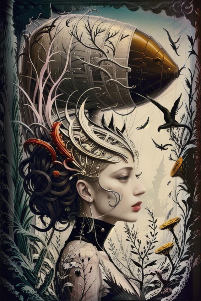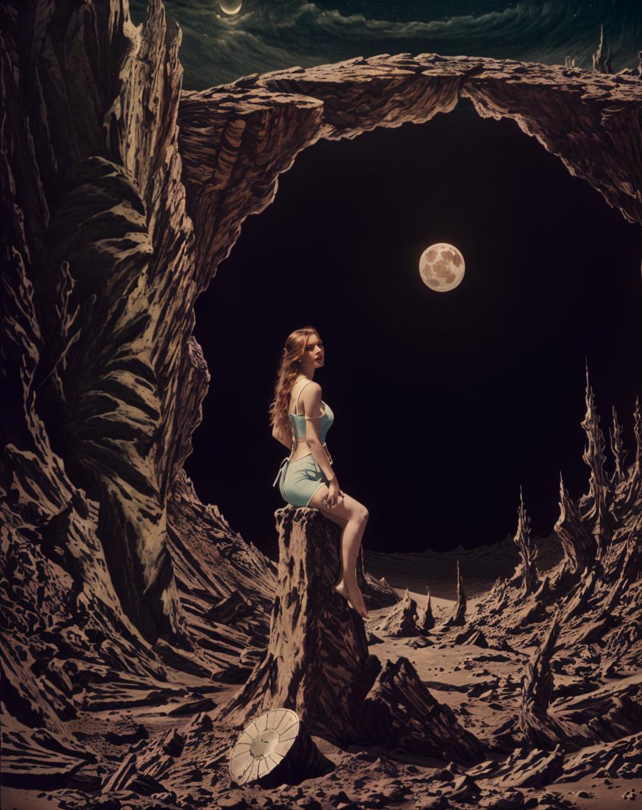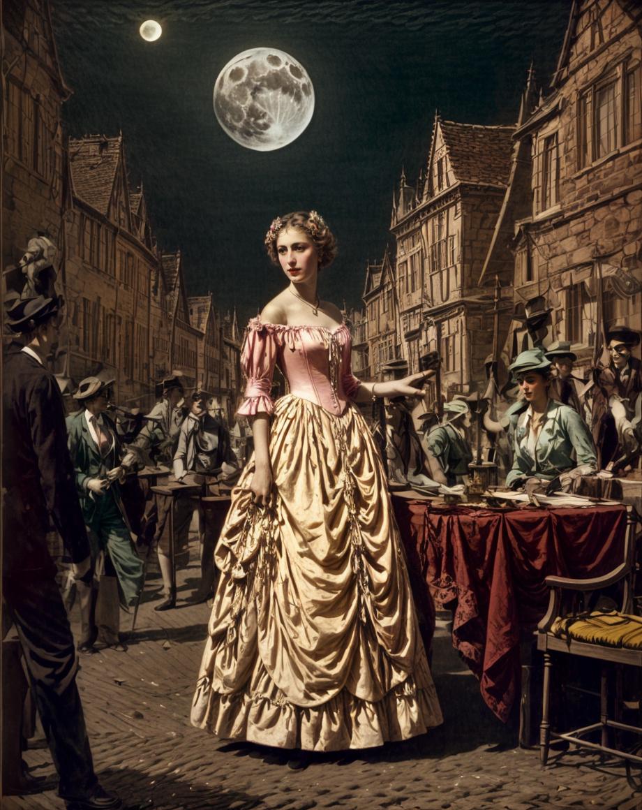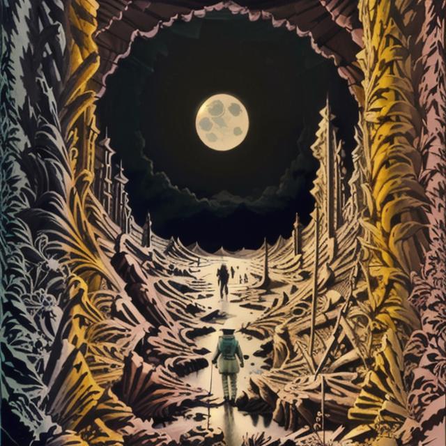This model was trained on hand-coloured prints of the 1902 motion picture A Trip to the Moon (Le voyage dans la lune). Written by, directed by and starring Georges Méliès, the film took audiences on a fantastic journey to the Moon by means of never-before-seen practical effects. The film's ornate visual style is rooted in the French tradition of féerie or fairy plays, which featured beautiful costumes and lavish mechanised scenery.
