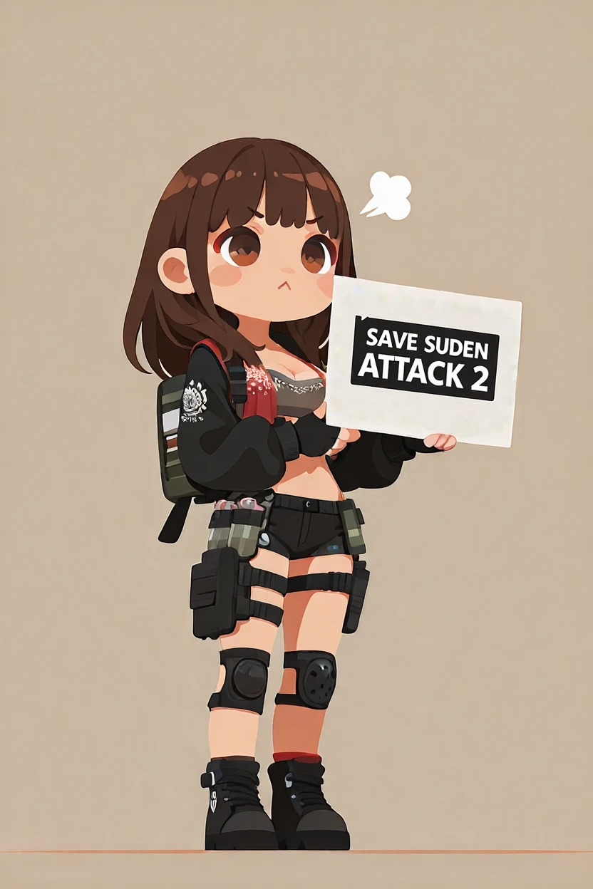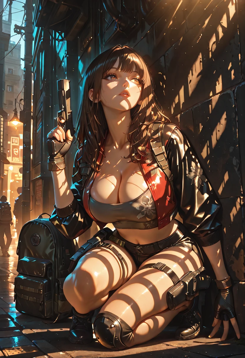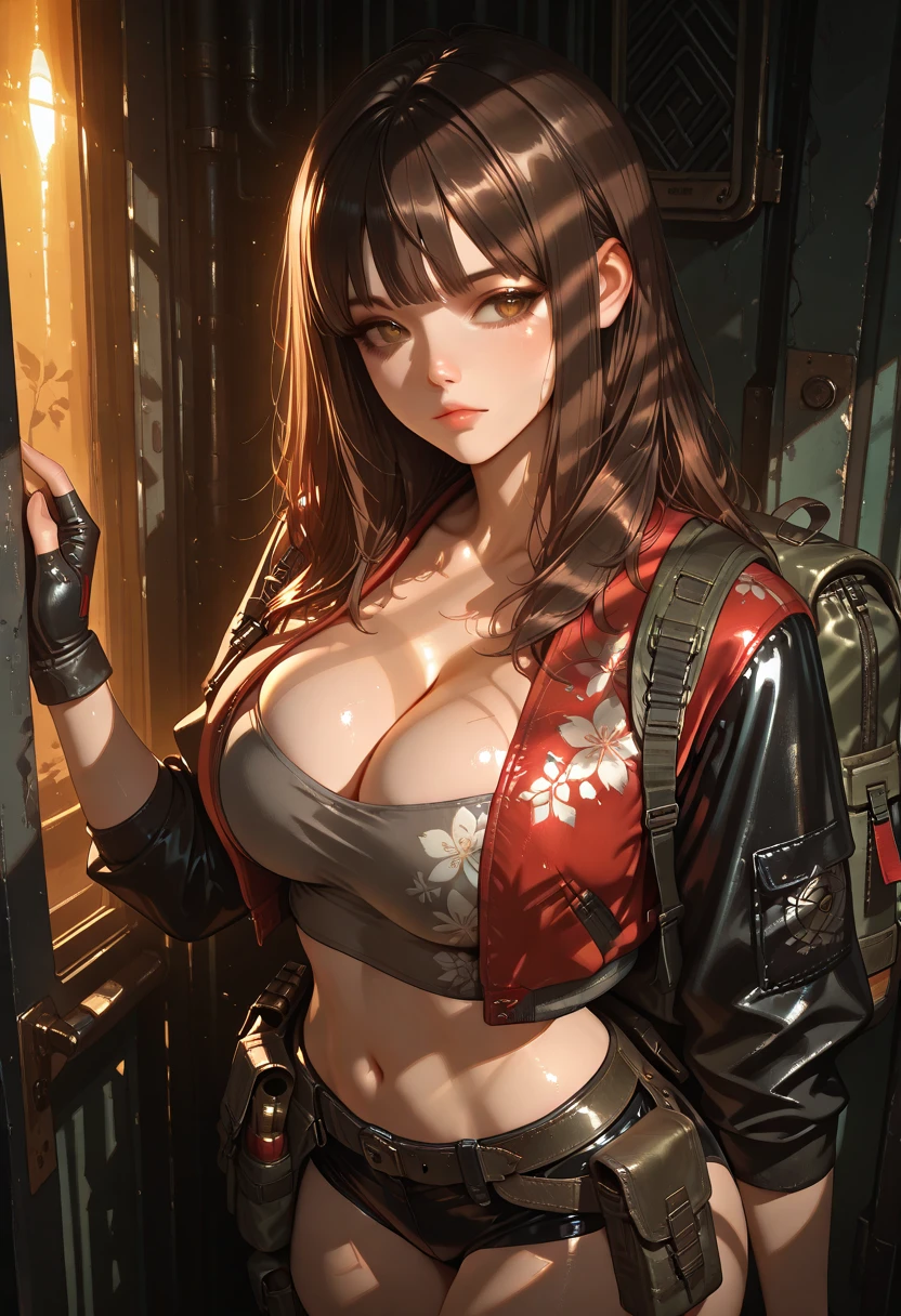 default outfit : gray tube top, cleavage, black fingerless gloves, floral_print_red_leather_crop_jacket, black three-quater sleeves, military backpack, black micro shorts, ammunition pouch, thigh holster, thigh strap, single knee pad, black sneakers,