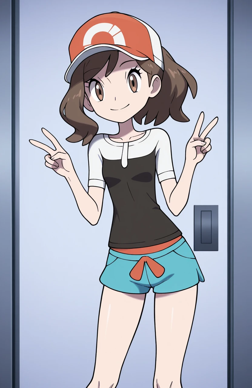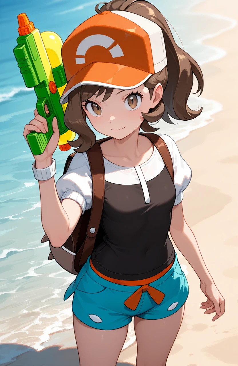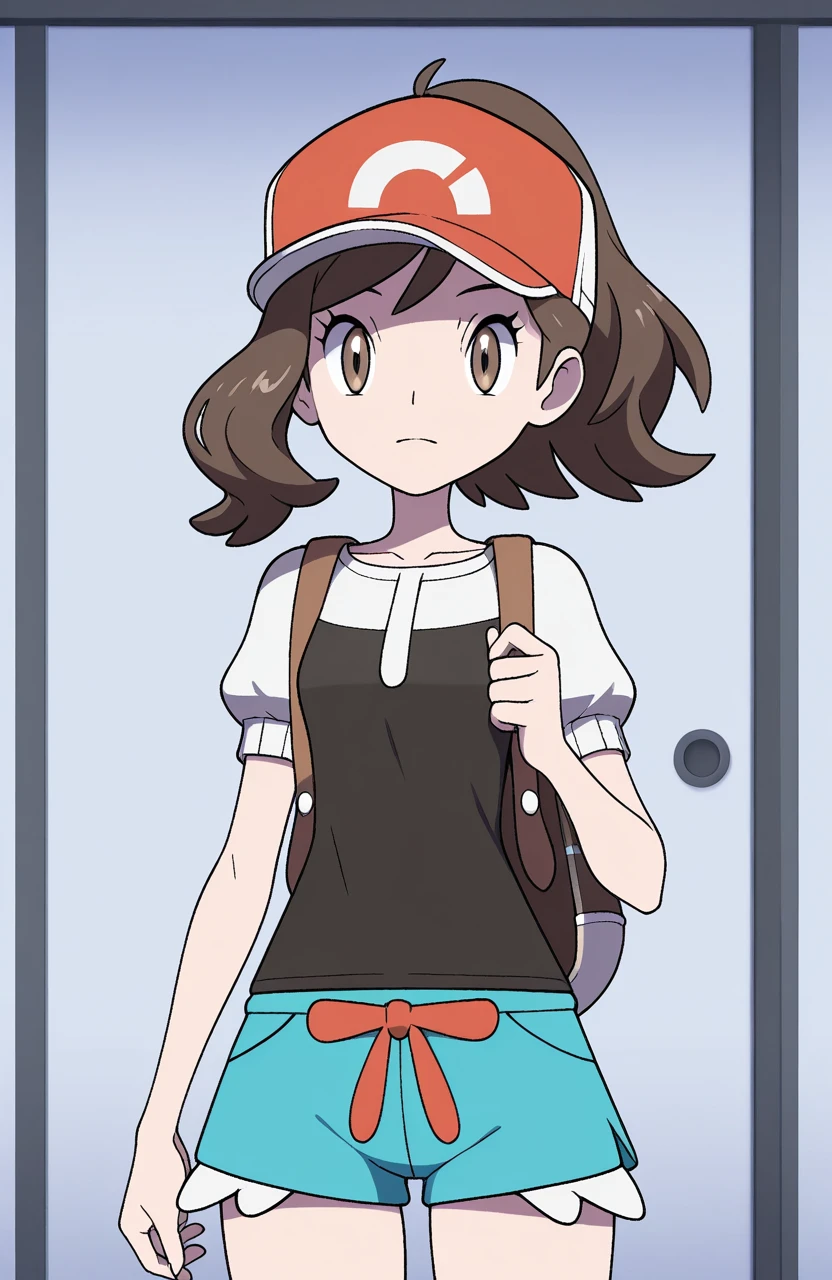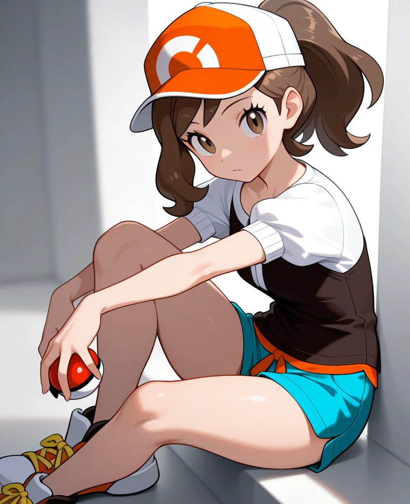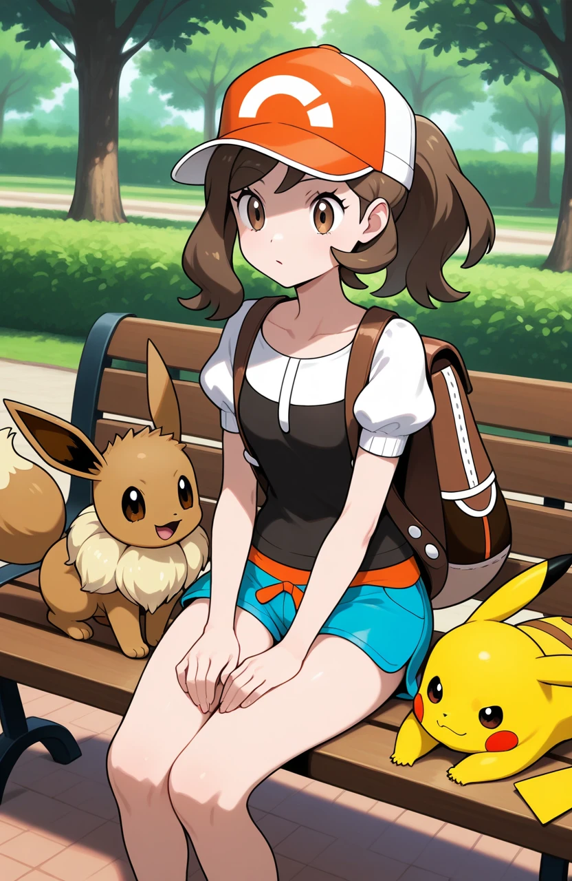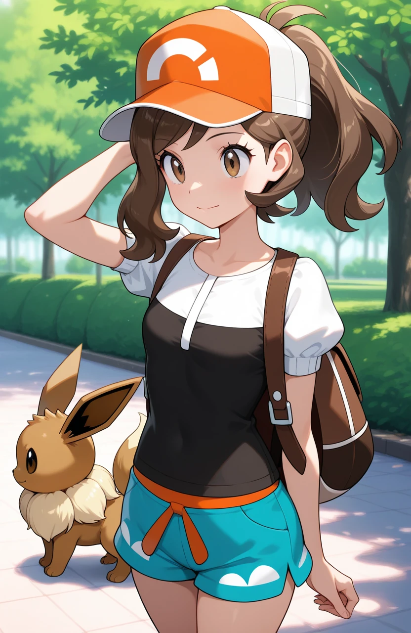 , elaine \(pokemon\), brown hair, brown eyes, ponytail, baseball cap, white shirt, black shirt, blue shorts, short shorts, sneakers,
