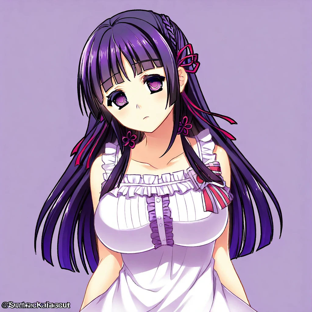 purple hair, long hair, crown braid, blunt bangs, hair ribbon, purple eyes, large breasts,