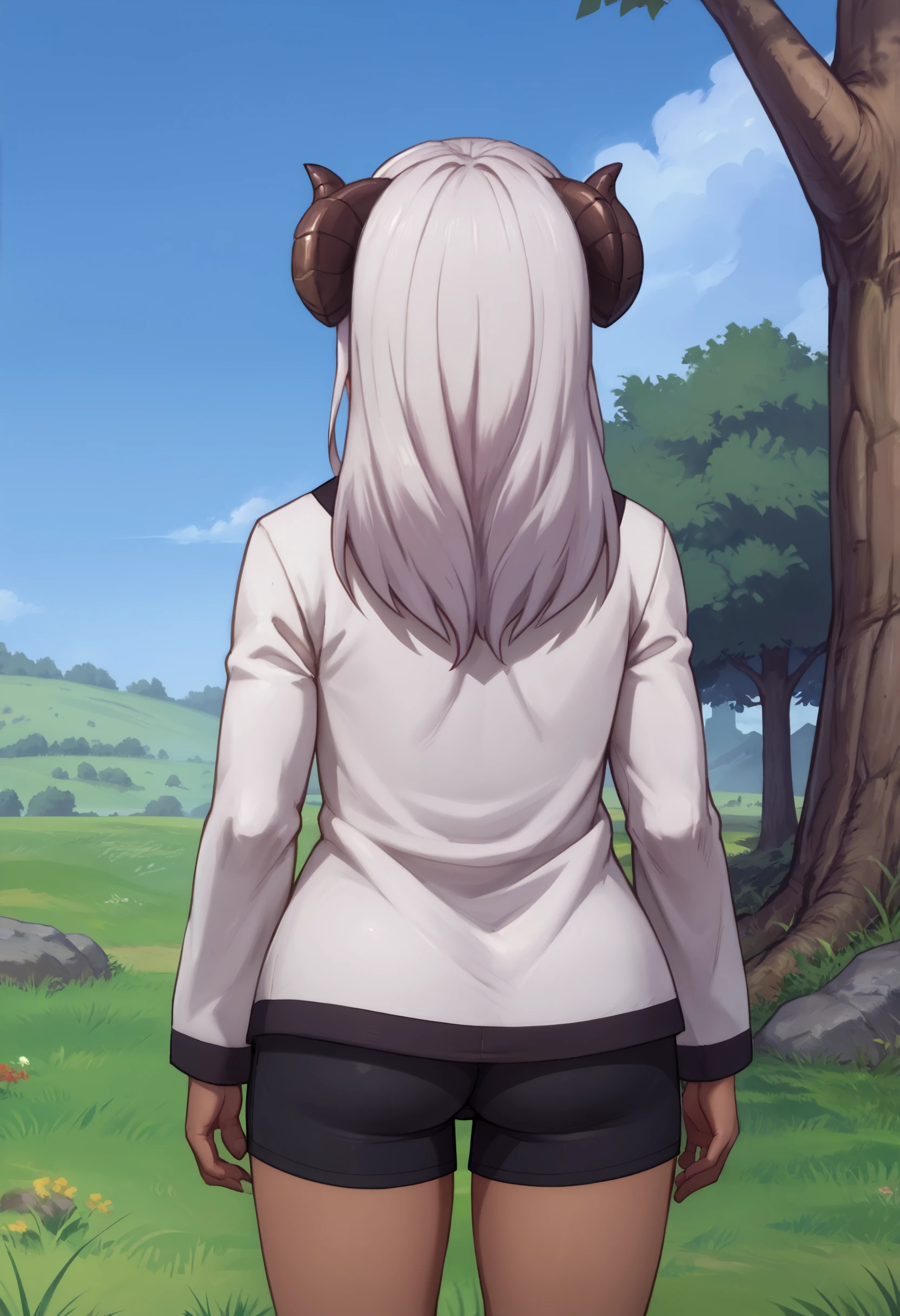 white dress, black shorts, long sleeves, choker for her usual outfit. covered collarbone can help if choker is making the cover disappear.