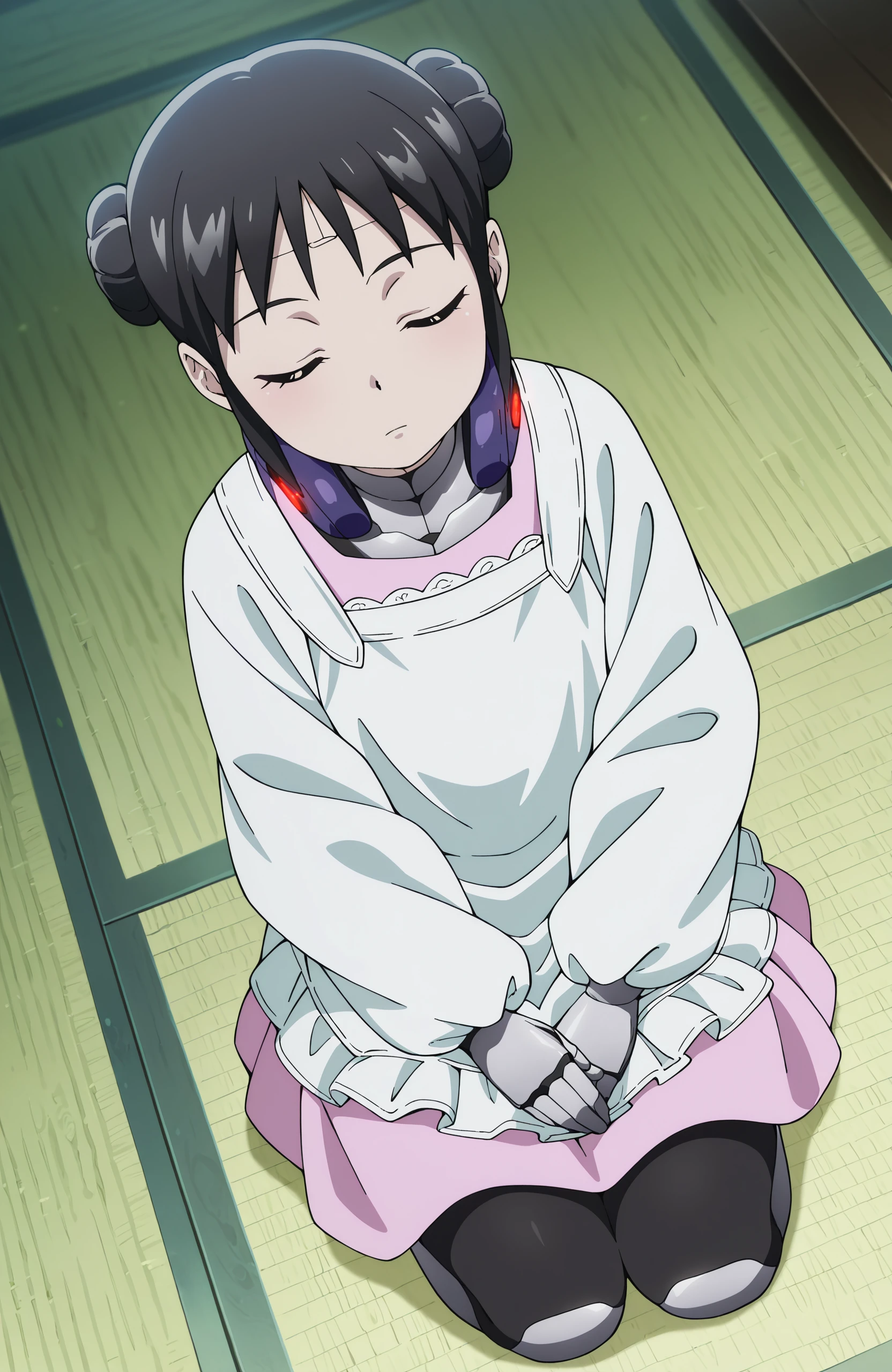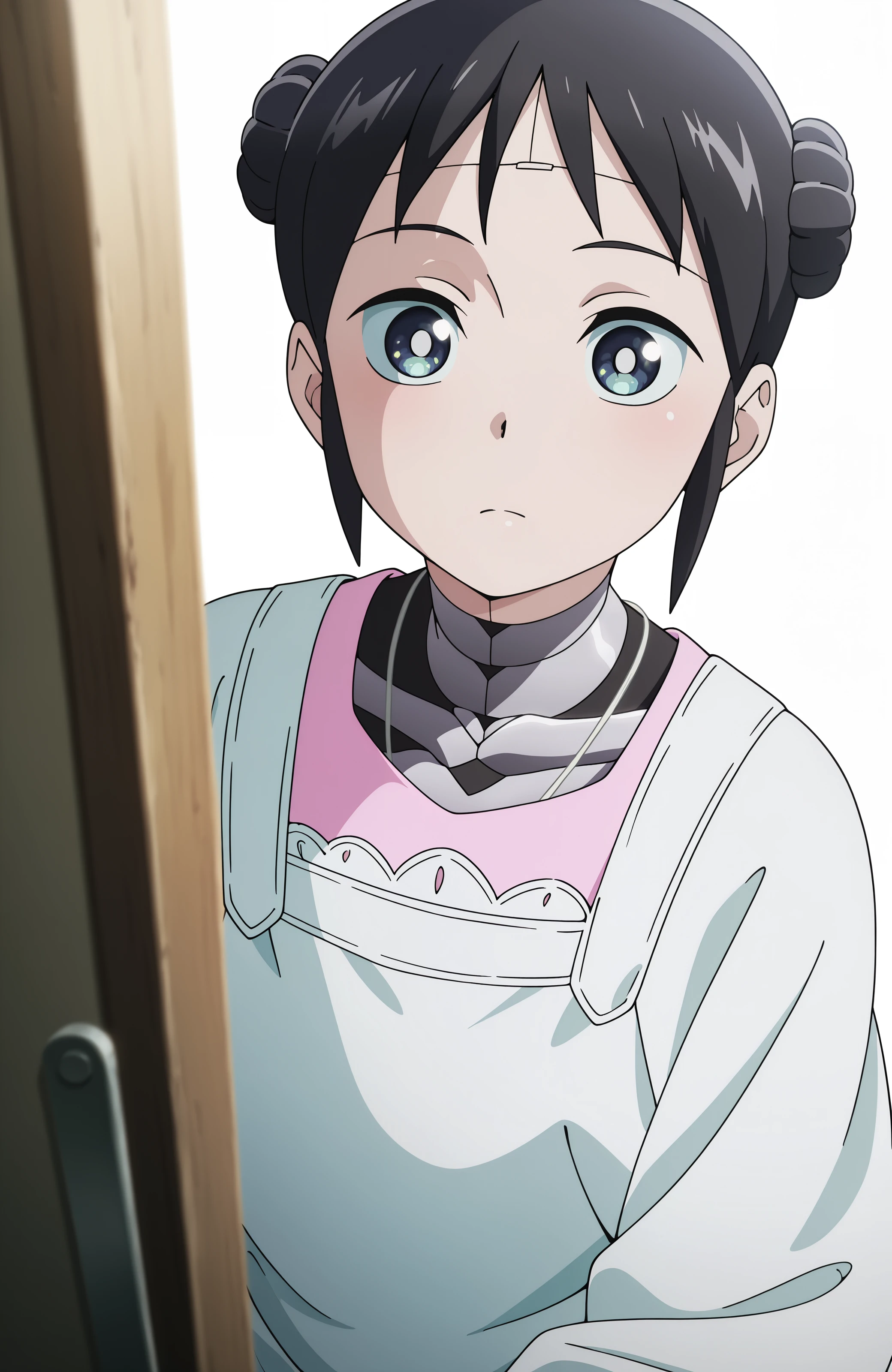 Add neck charger, mina, double braided bun, short hair, dress, white apron