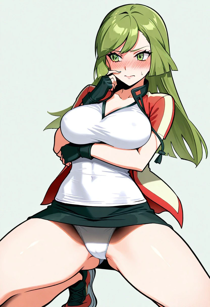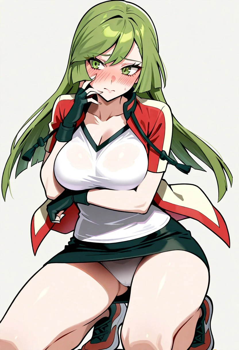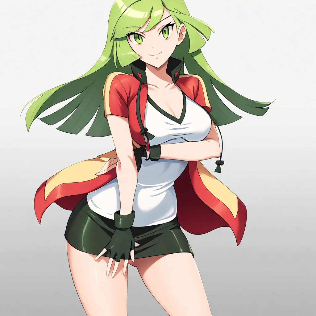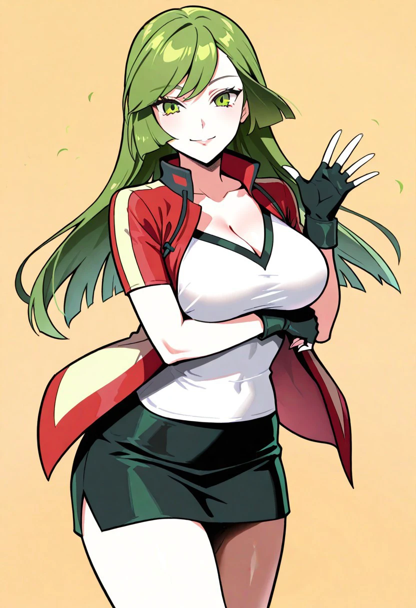 Outfit: AceORASClothes, red and yellow jacket, white shirt, black miniskirt, pencil skirt, sneakers, black fingerless gloves