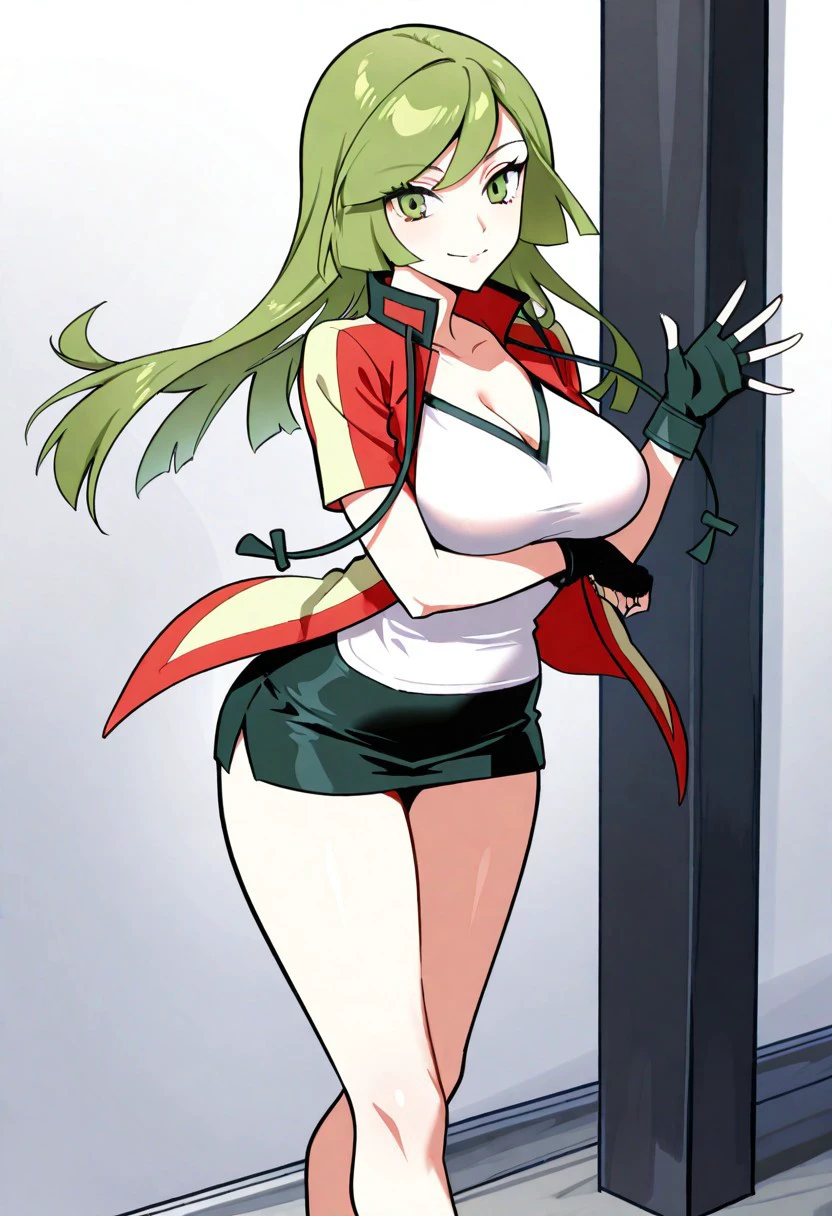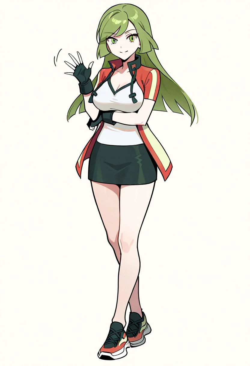 AceOrasClothes, red and yellow jacket, white shirt, black miniskirt, pencil skirt, sneakers, black fingerless gloves