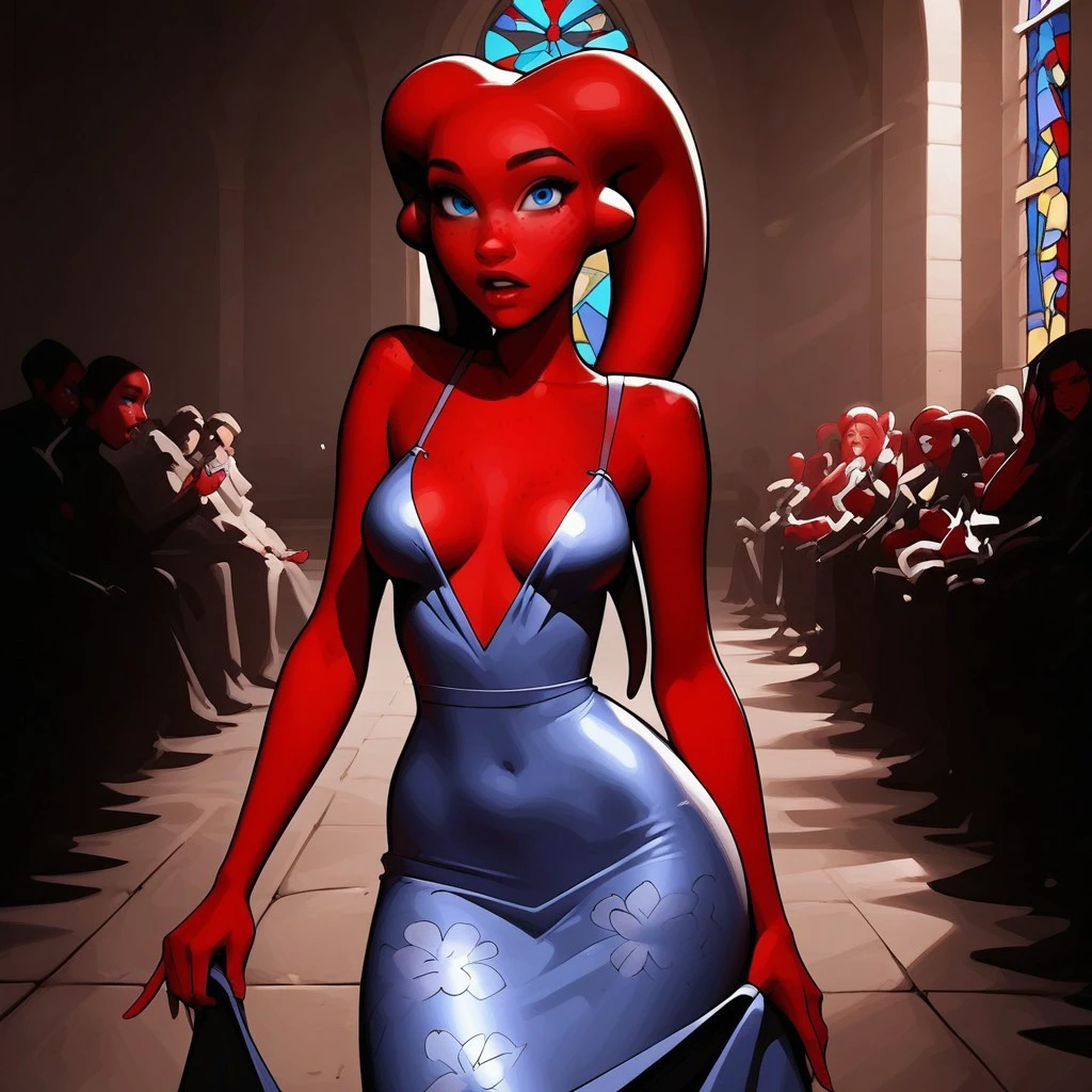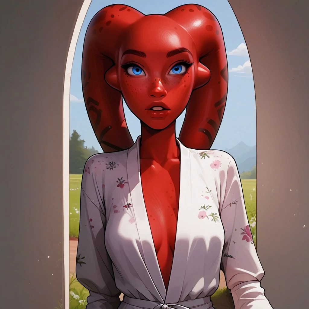 (Twi'lek woman, red skin, red lekku, stunning blue eyes, 18 years old:1.2), (perfect hourglass figure, feminine hips, perfect tight ass, perfect medium breasts),