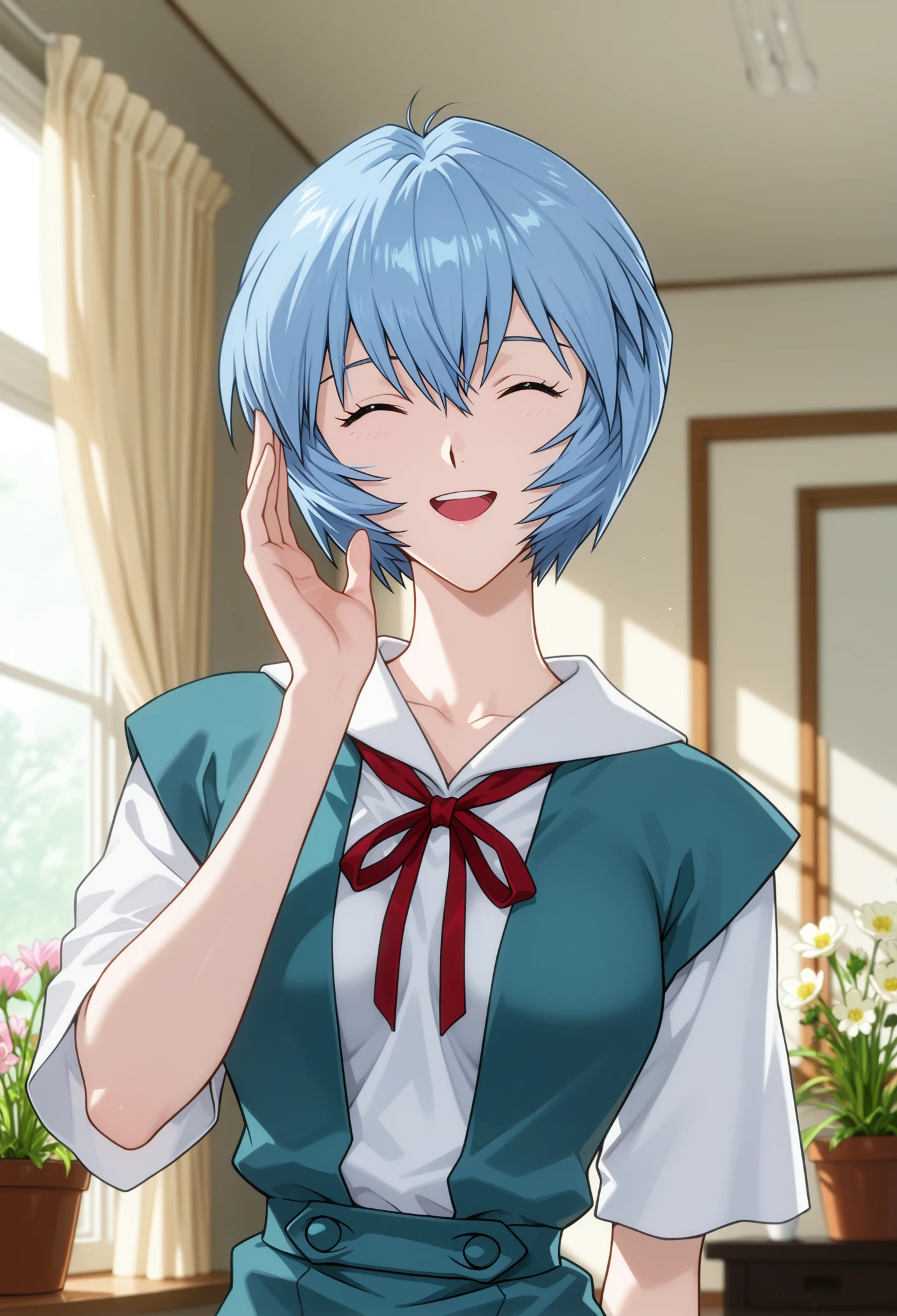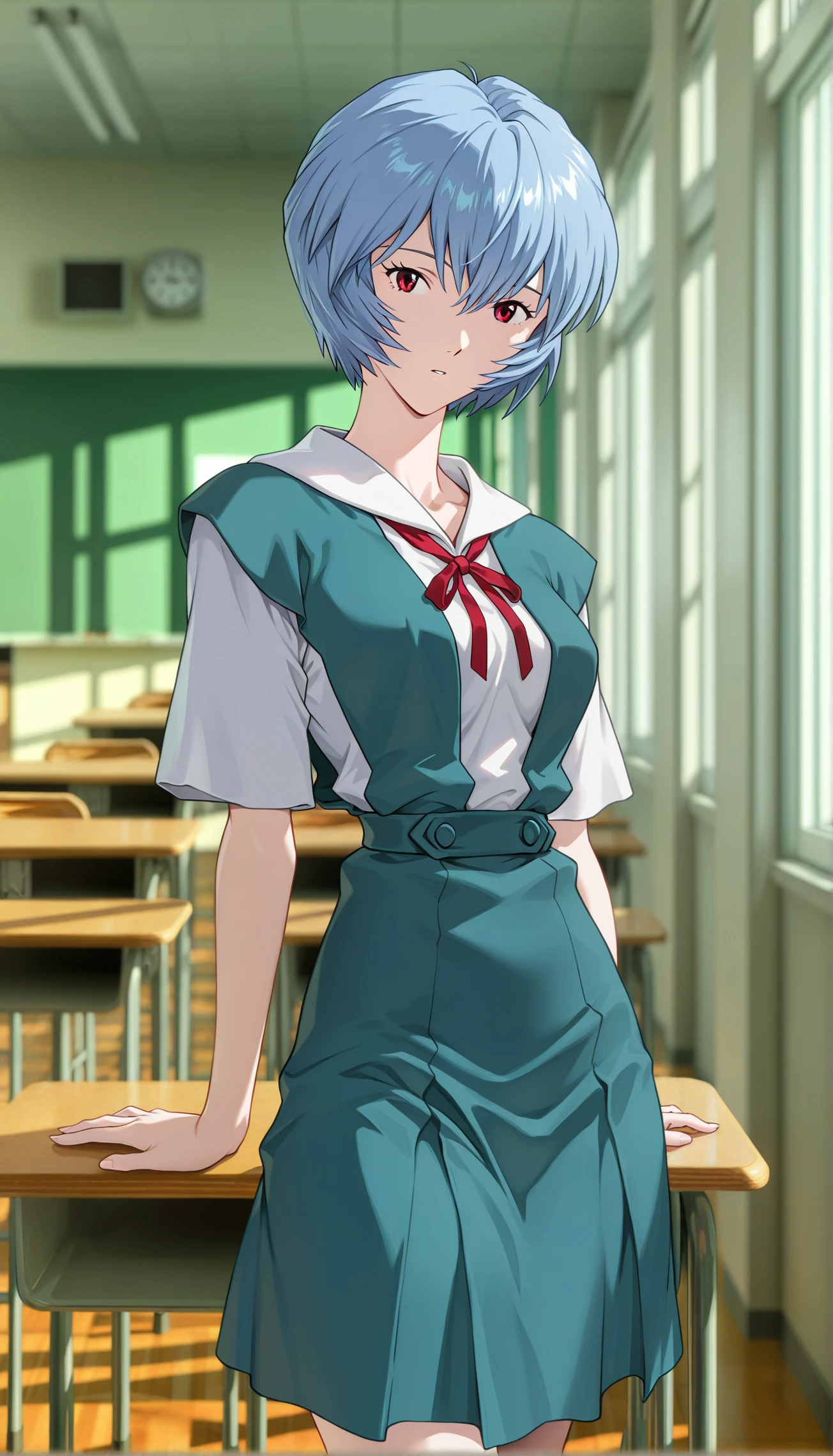 ayanami rei, 1girl, short hair, tokyo-3 middle school uniform, shirt, suspender skirt, neck ribbon, red ribbon