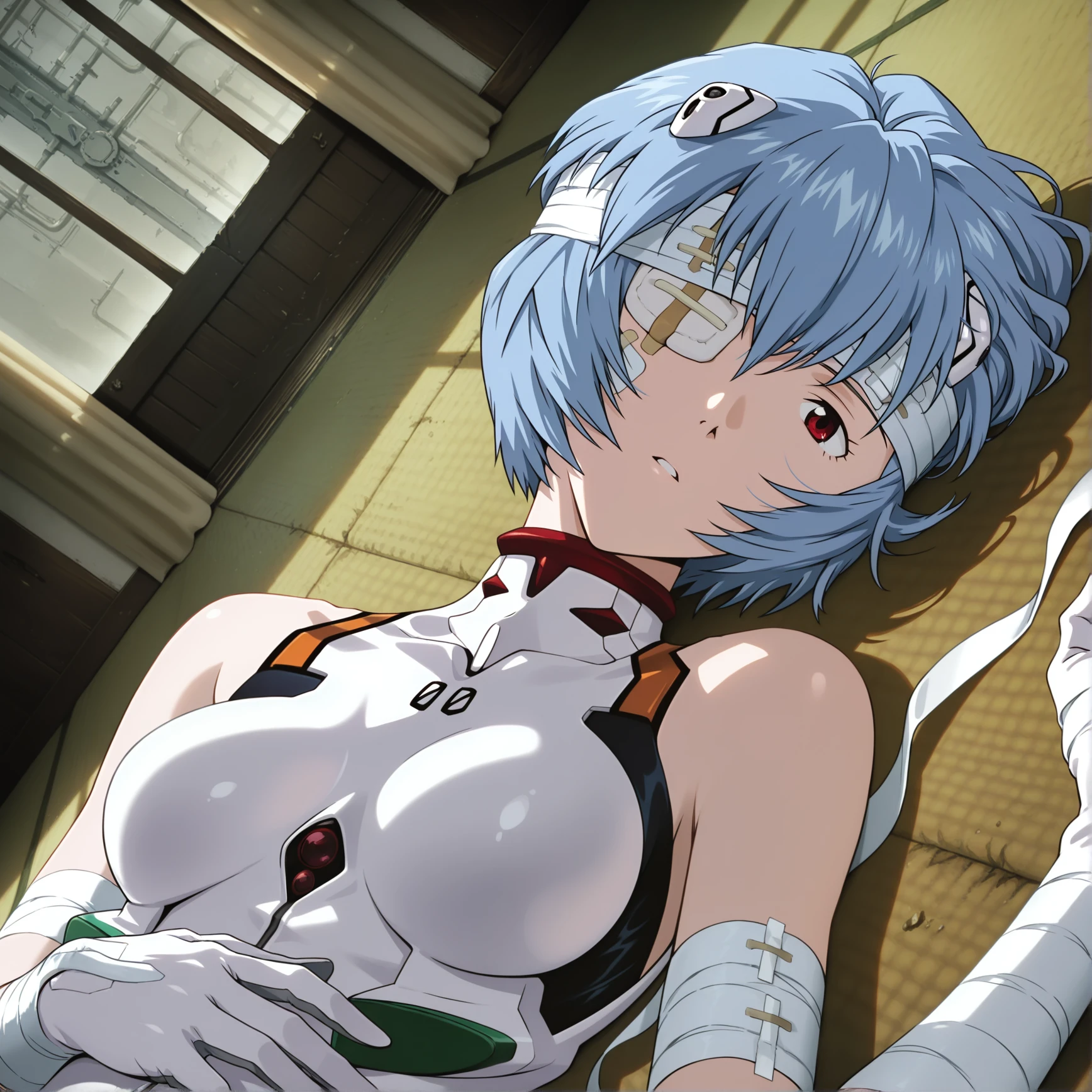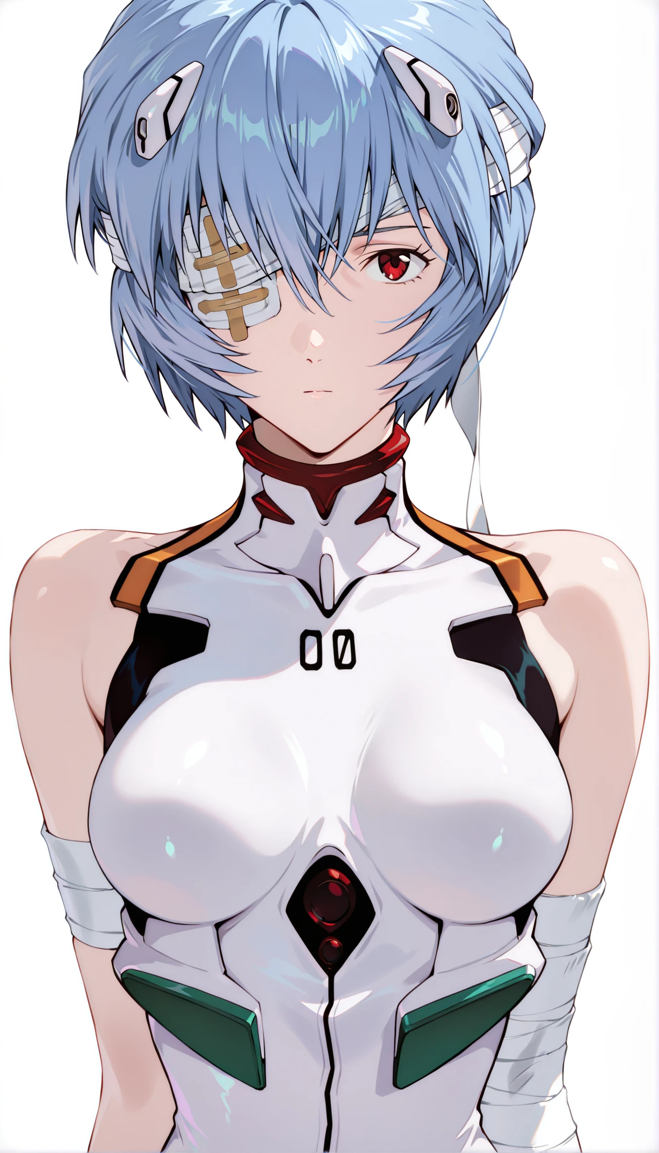 ayanami rei, 1girl, short hair, eyepatch, bandages, bandage over one eye, bandaged arms, white bodysuit, pilot suit, plugsuit, bare shoulders