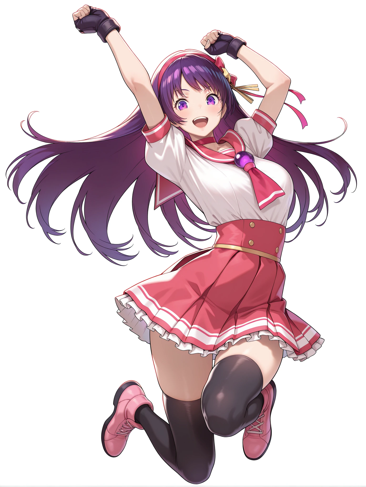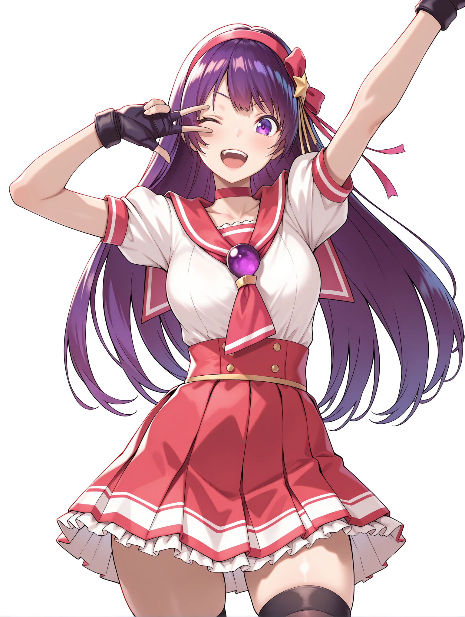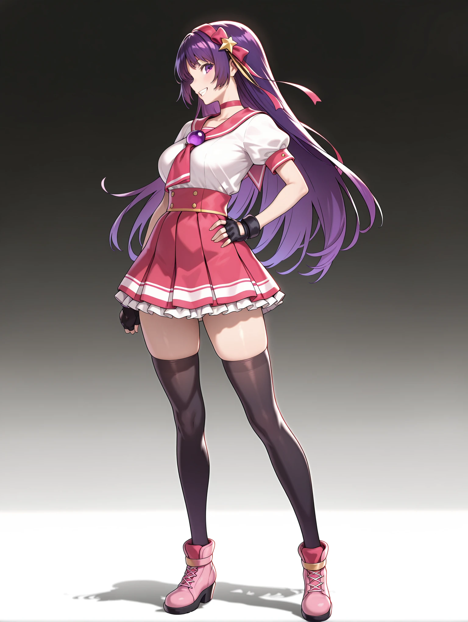 a_clothes,red choker,sailor collar,puffy short sleeves,fingerless gloves,pleated skirt,black thighhighs,pink footwear,