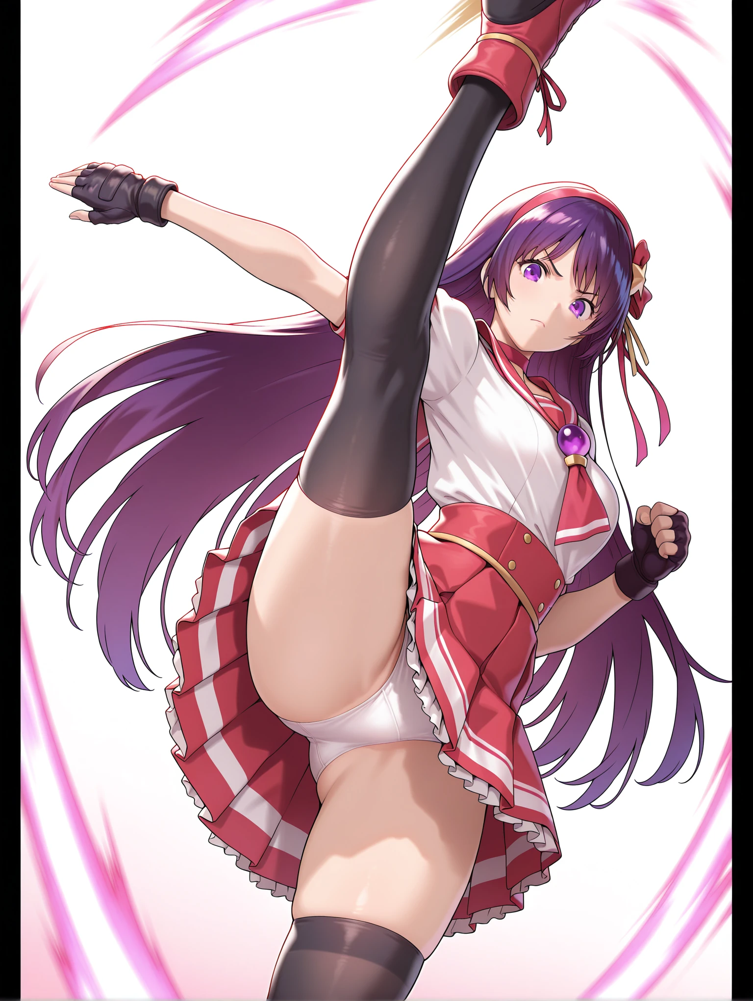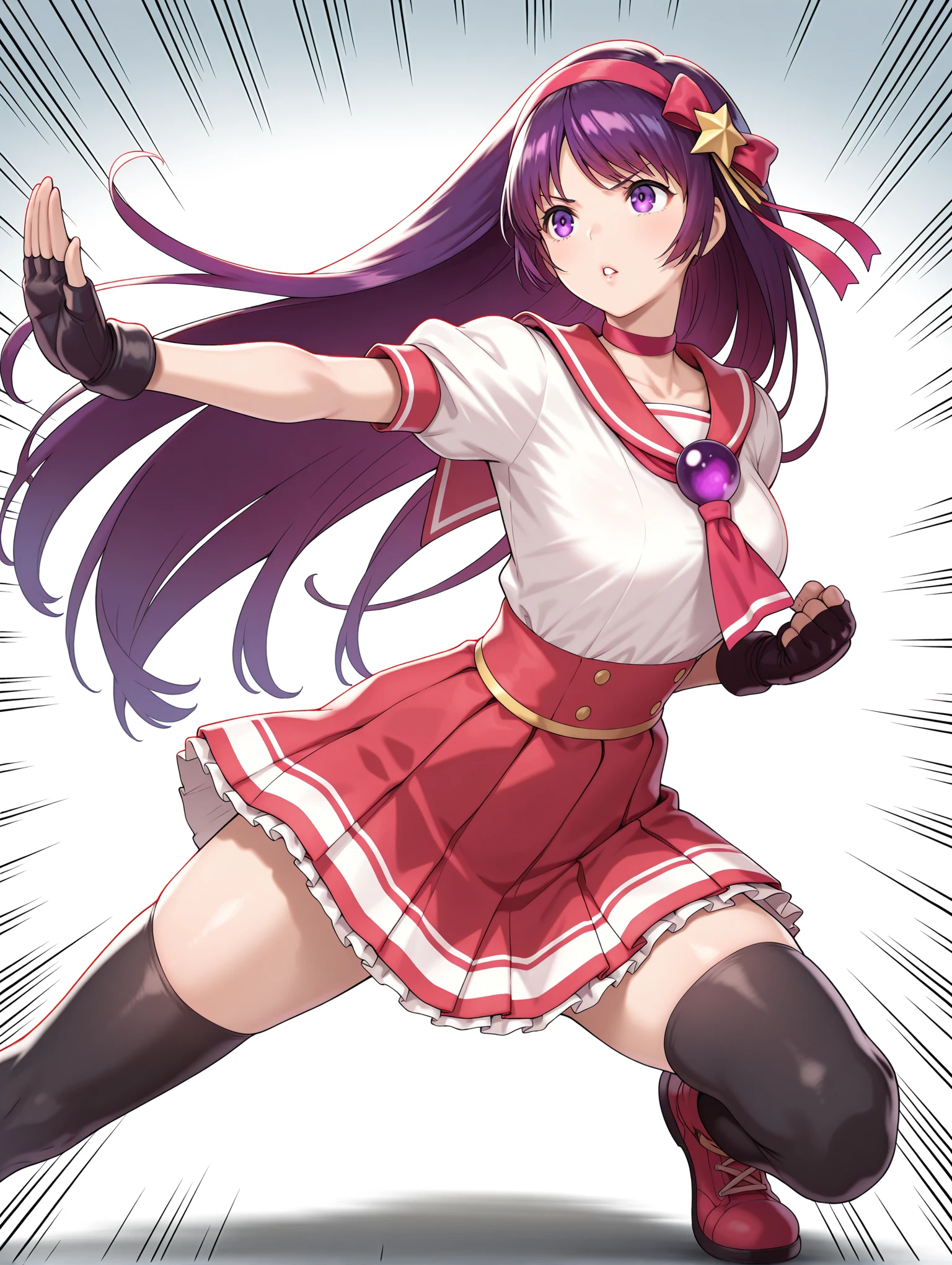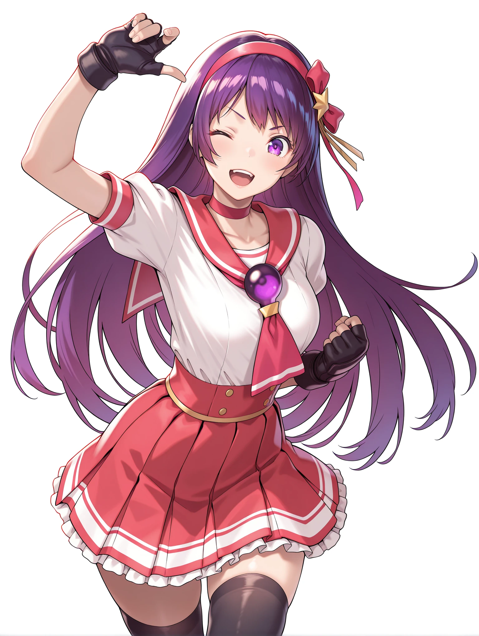 a_clothes,red choker,sailor collar,puffy short sleeves,fingerless gloves,pleated skirt,black thighhighs,pink footwear,