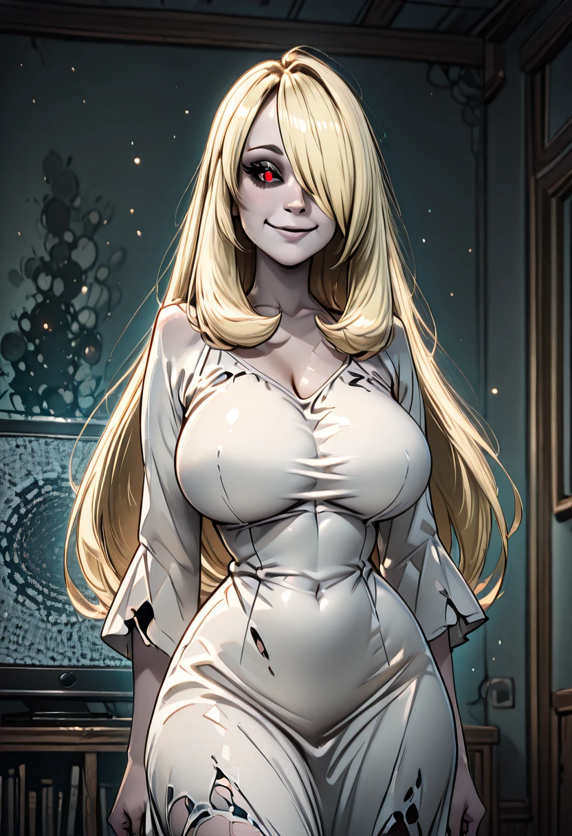 zzCynthiaSadakoCitron, blonde hair, long hair, hair over one eye, horror, oversized clothes, torn clothes, white dress, television, static, glowing, light particles, blurry background,