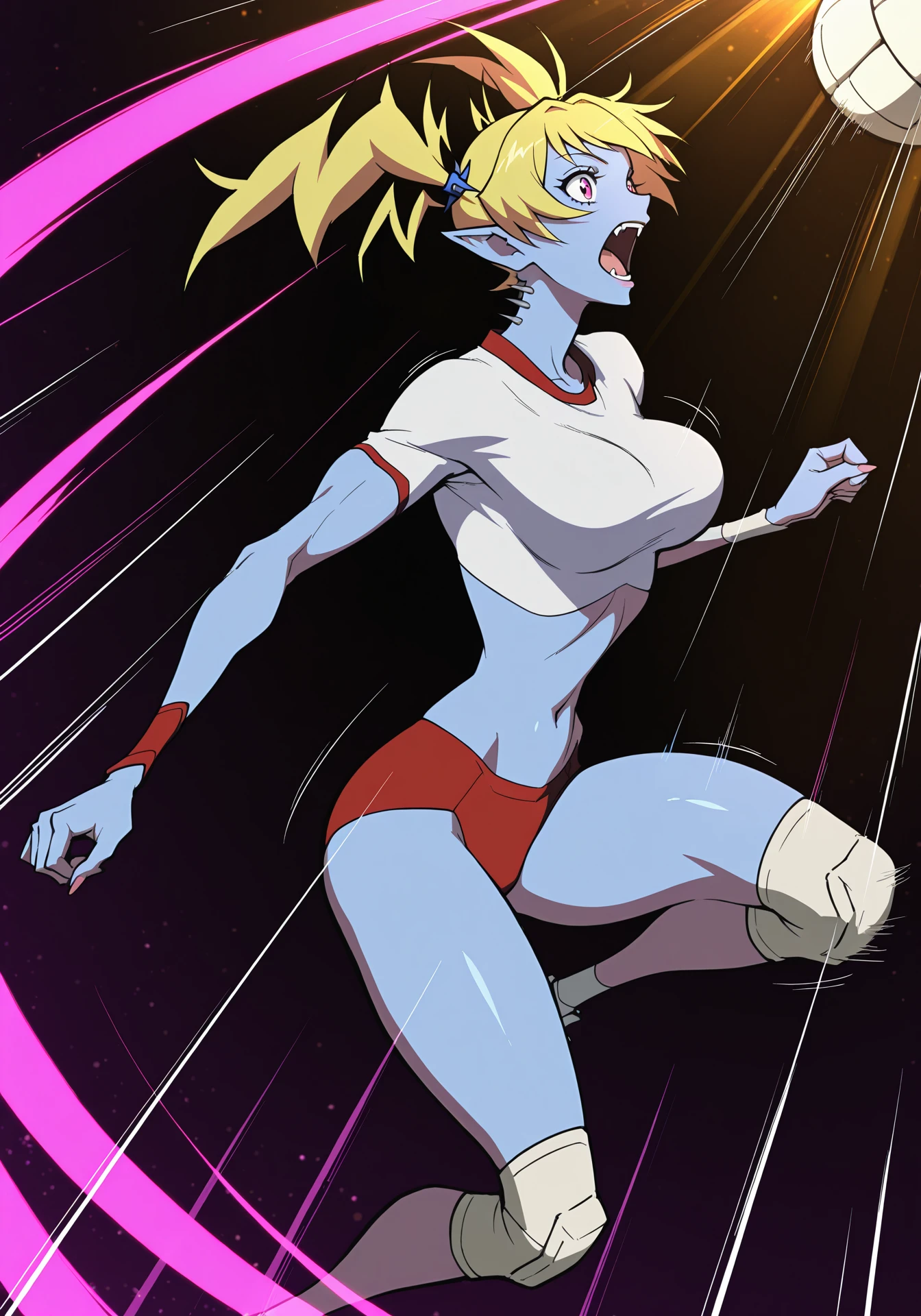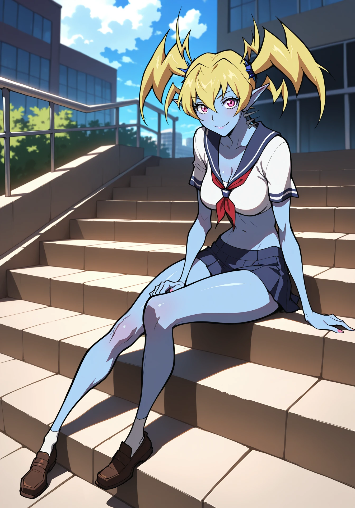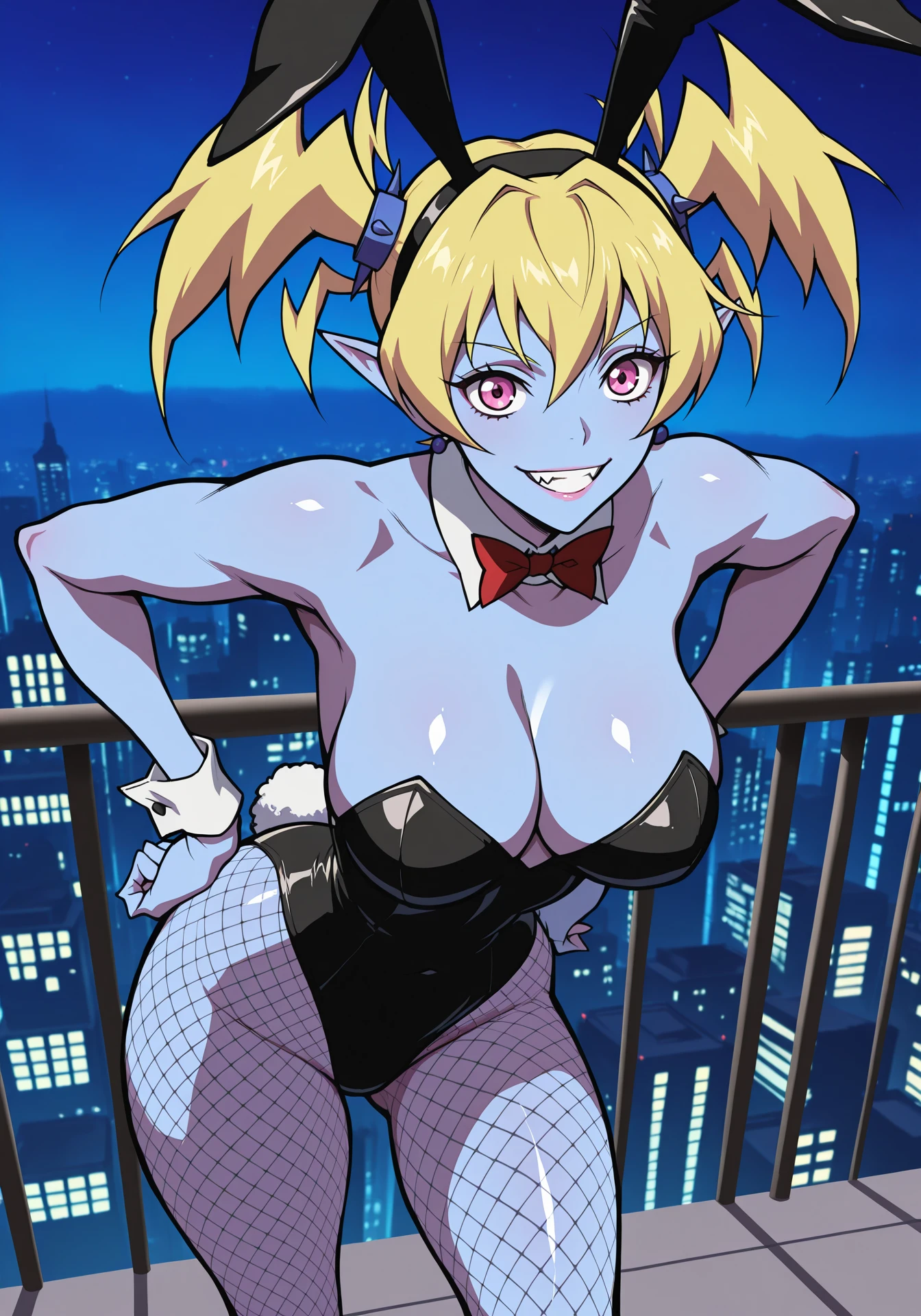 eastwitchescaptain, colored skin, blue skin, blonde hair, twintails, pointy ears, neck spikes, pink eyes, fangs