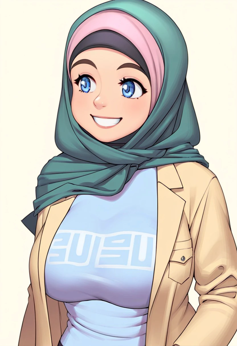 green hijab, blue shirt, yellow jacket
