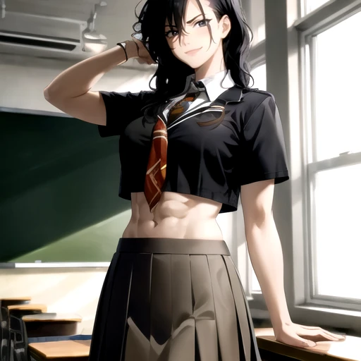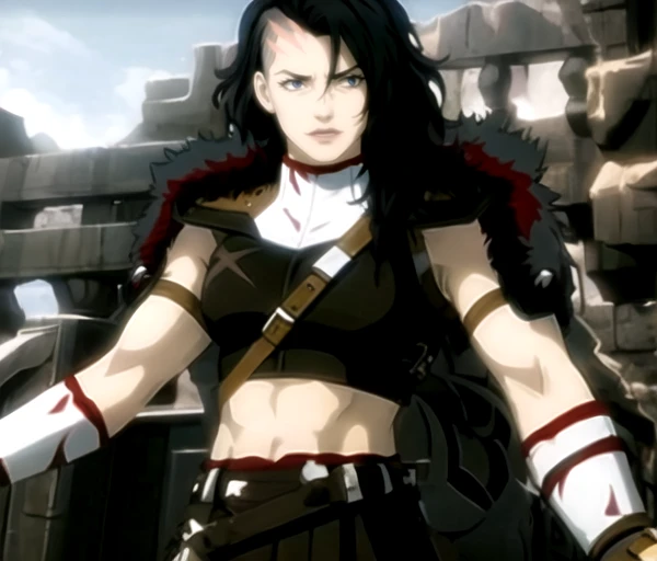 1. '1girl, the gladiatrix, black hair, hair pulled to side, multicolored hair, scar across eye, scars on face,'