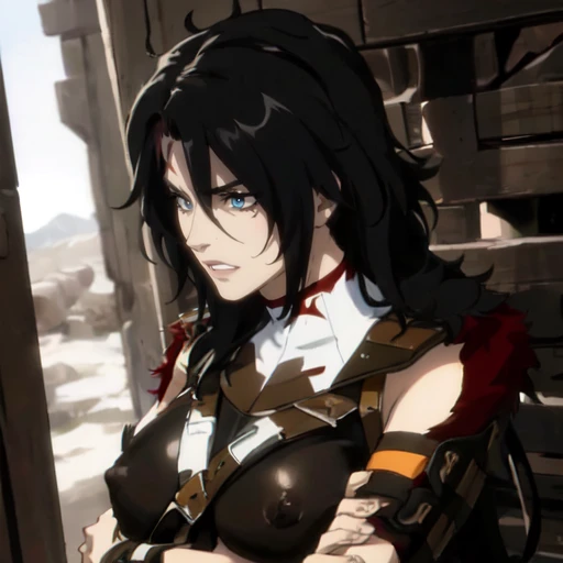 1girl, the gladiatrix, black hair, hair pulled to side, multicolored hair, scar across eye, scars on face,