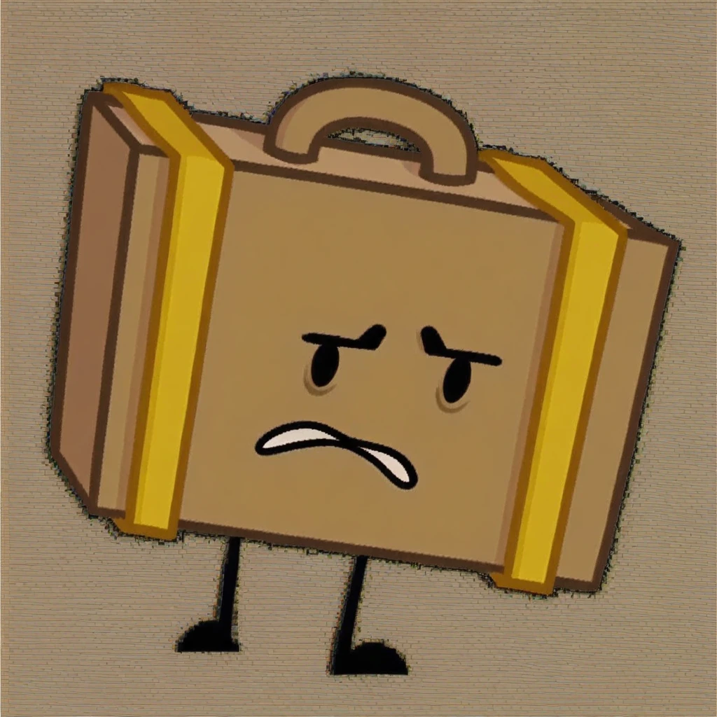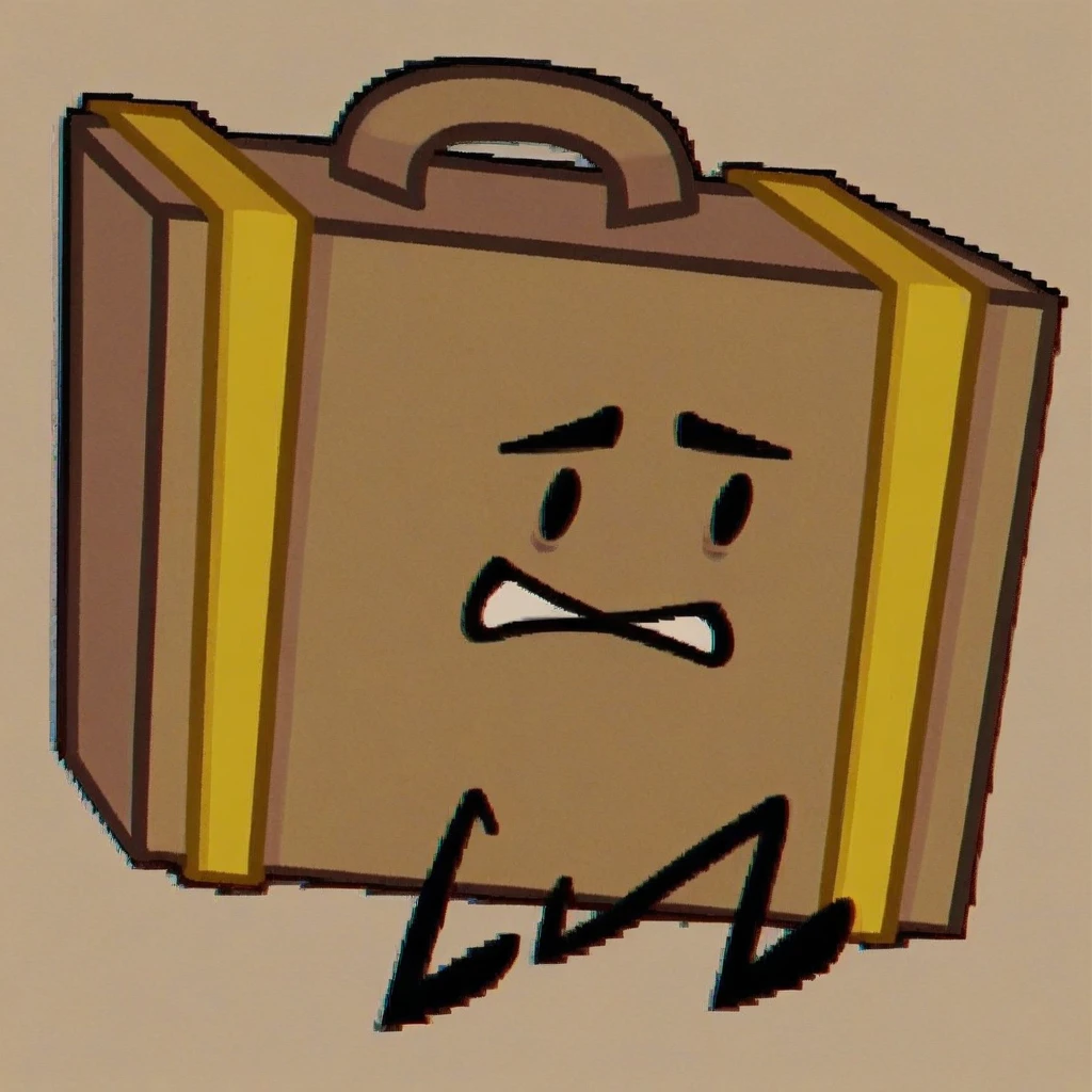 anthro, cartoony, suitcase body, brown body, yellow suitcase straps, handle on top, black dot eyes, thin black stick legs,