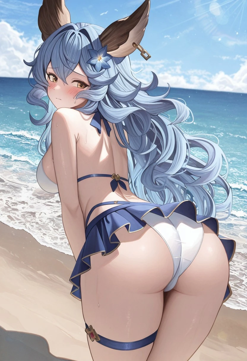 4(Swimsuit) = FerPhntmfMdsmmr,bikini skirt, white and blue swimsuit, thigh strap, flower, left ear clip,