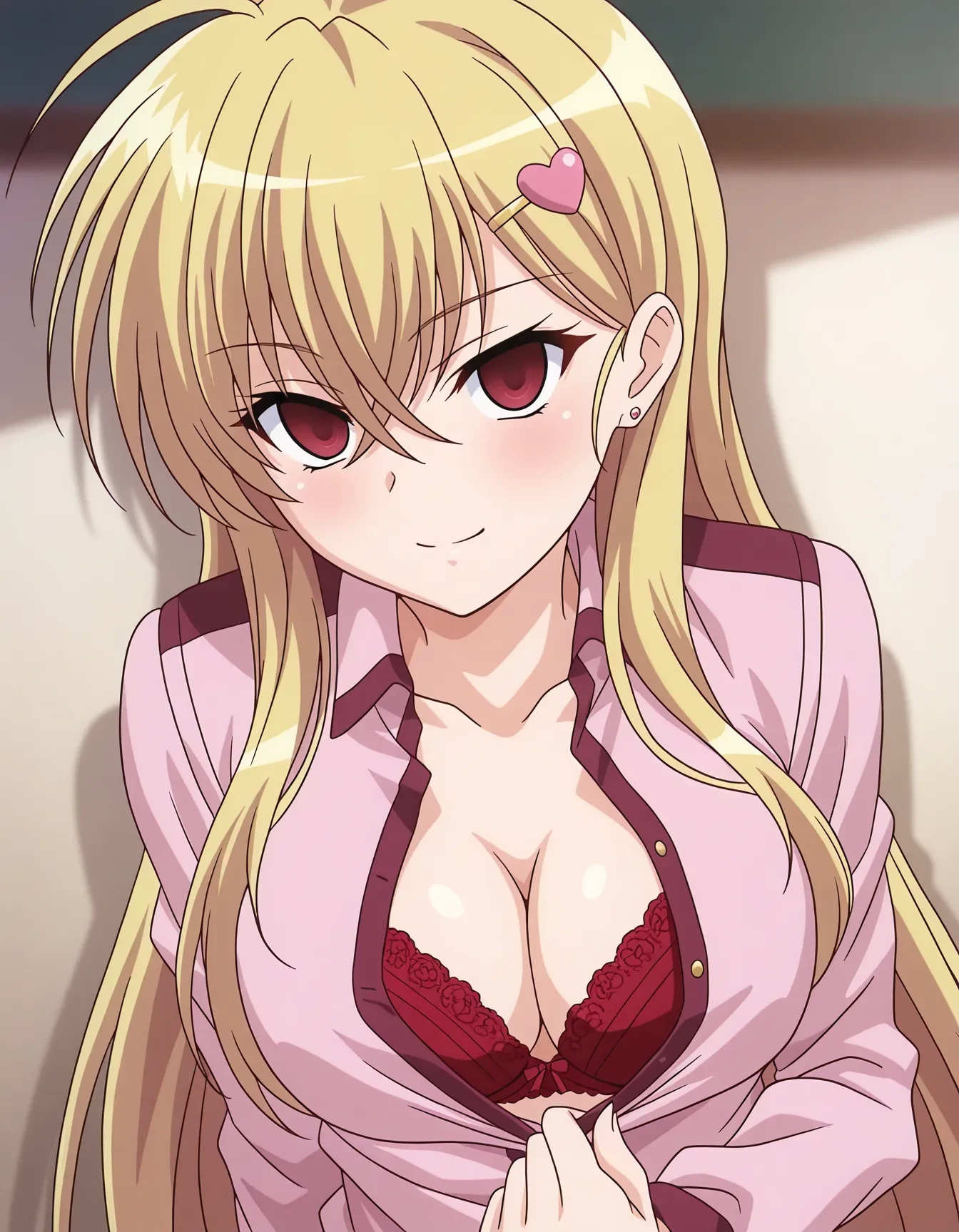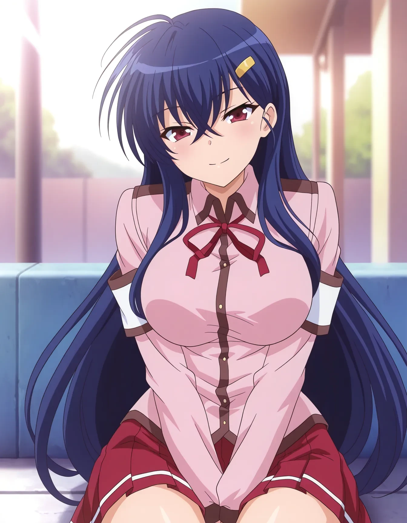 Outfit: school uniform, pink shirt, long sleeves, neck ribbon, red skirt, armband