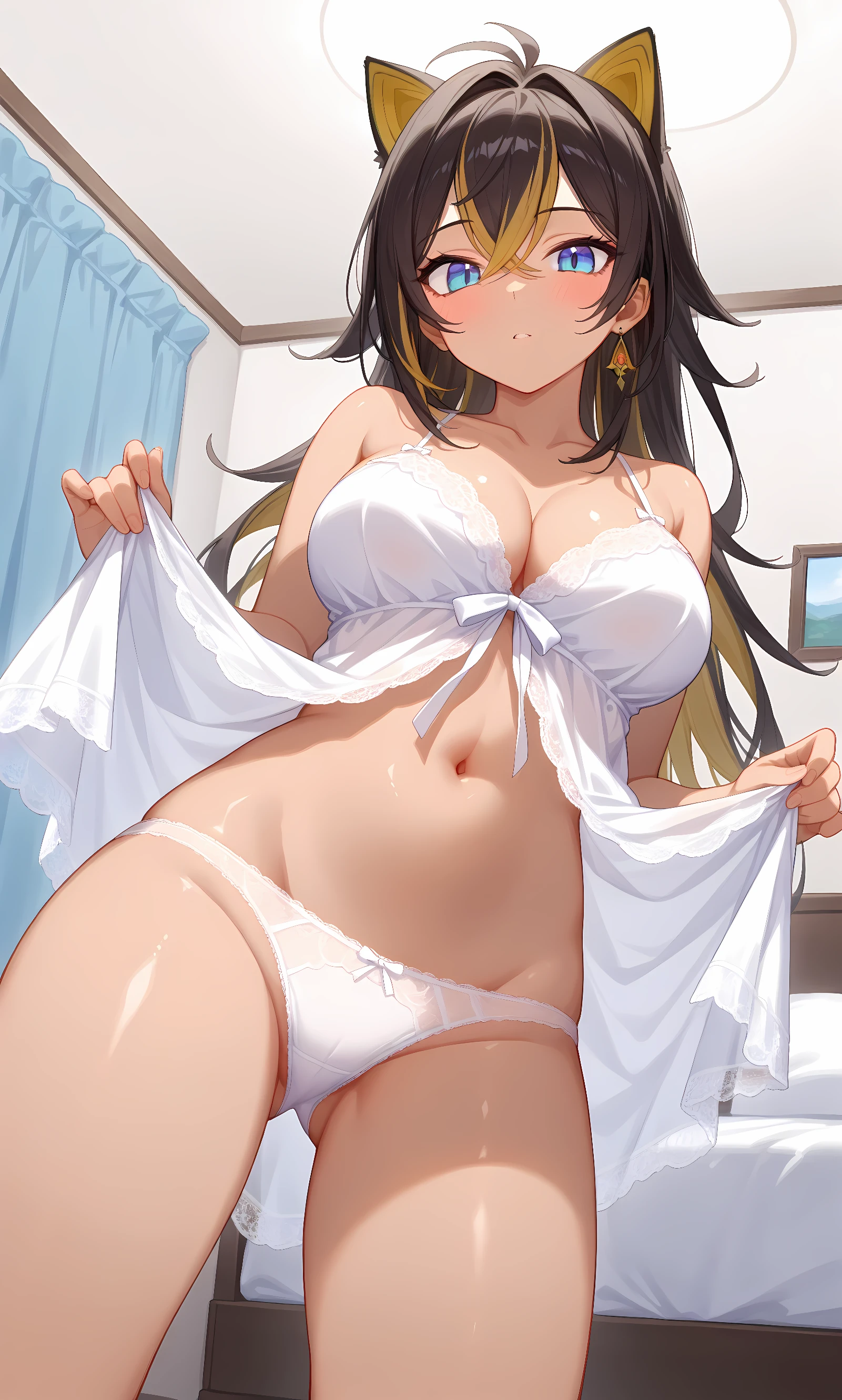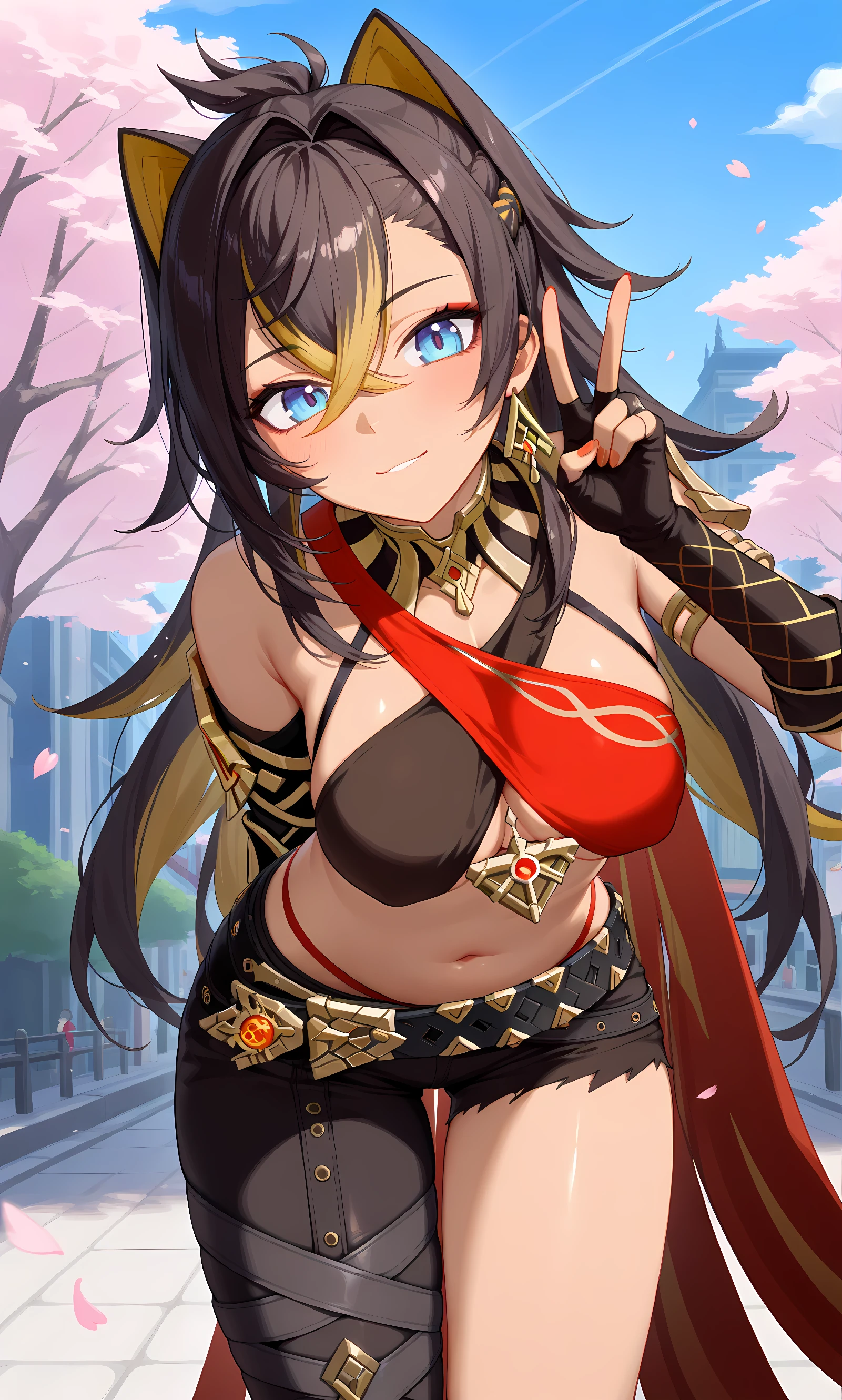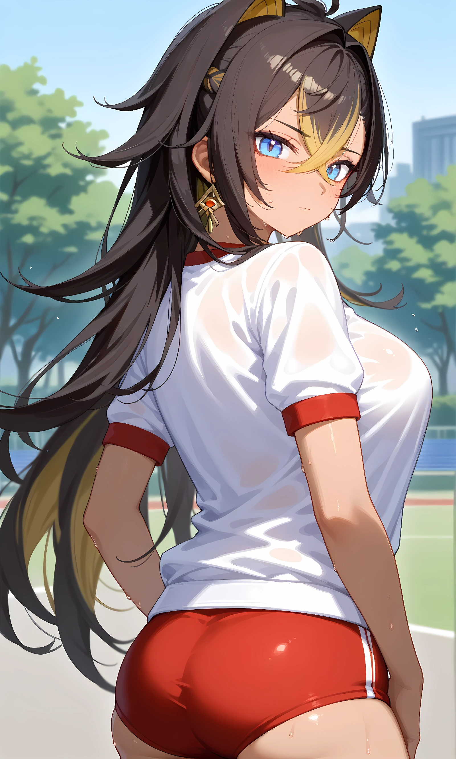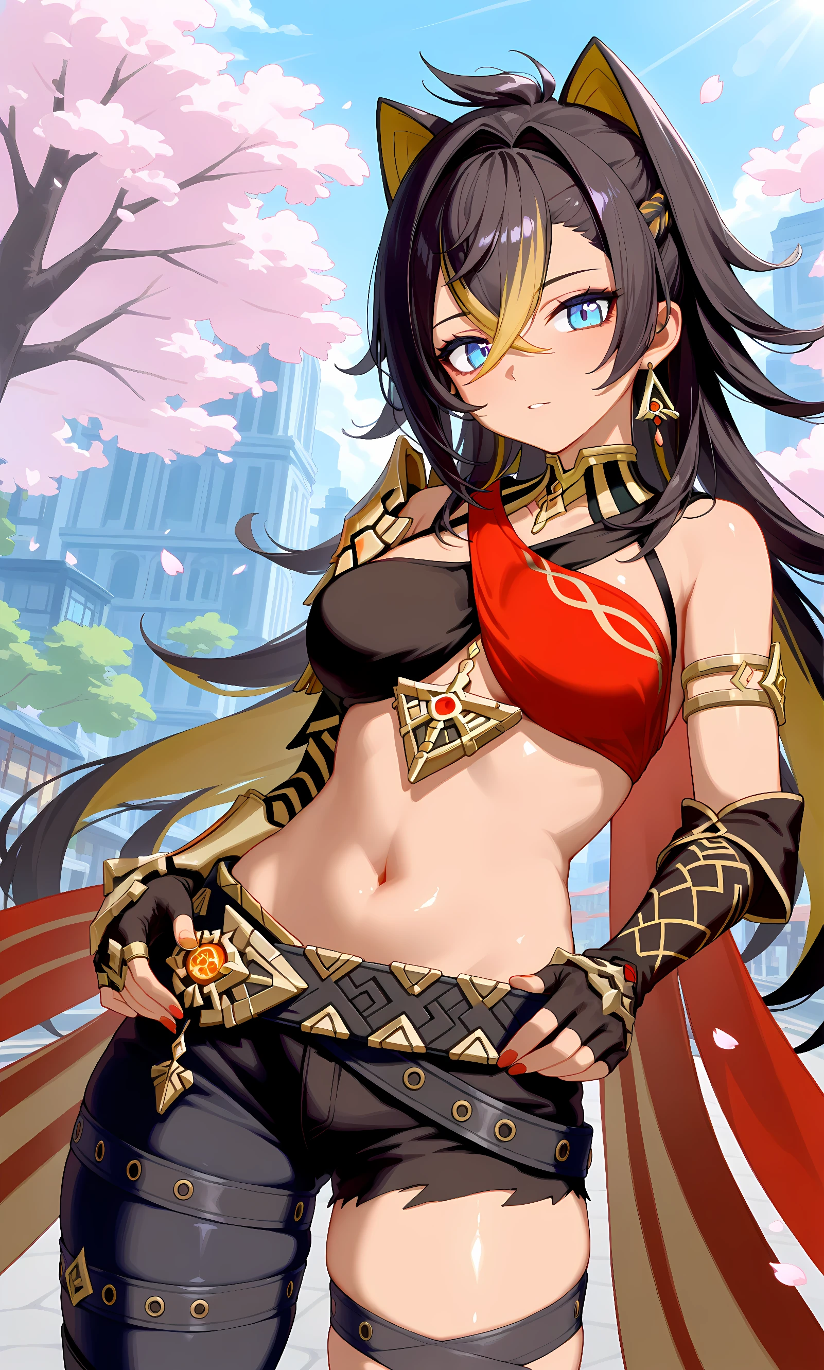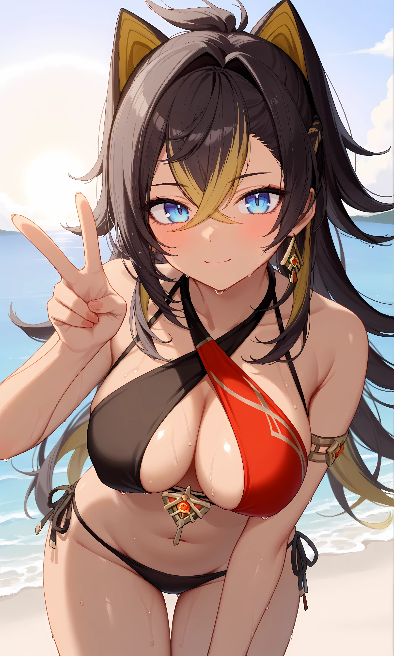 dehya (genshin impact), multicolored hair, streaked hair, long hair, blue eyes, black hair, blonde hair, dark skin, crossed bangs, earrings, animal ears