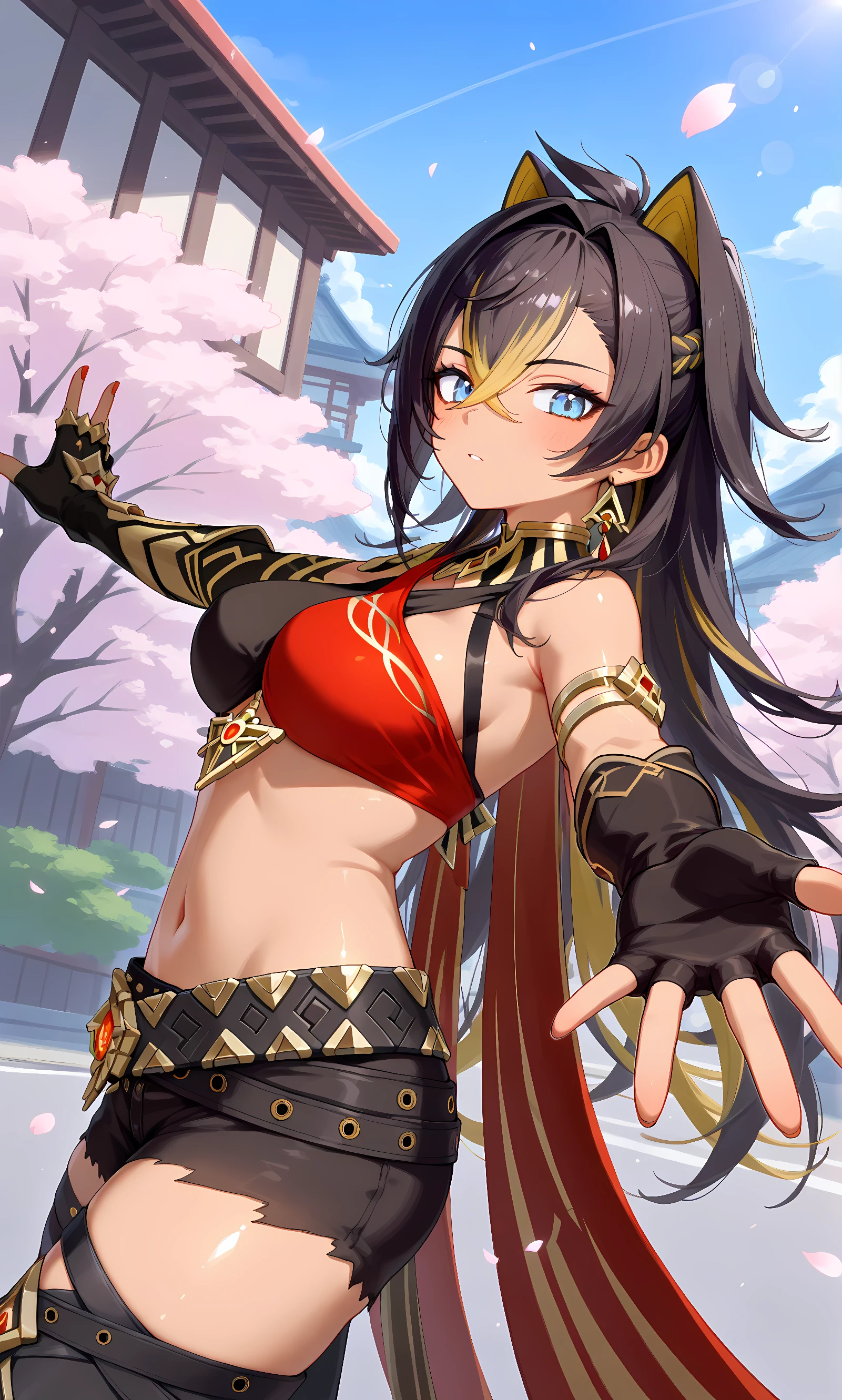 armlet, bare shoulders, black belt, black gloves, criss-cross halter, fingerless gloves, jewelry, navel, single pantsleg