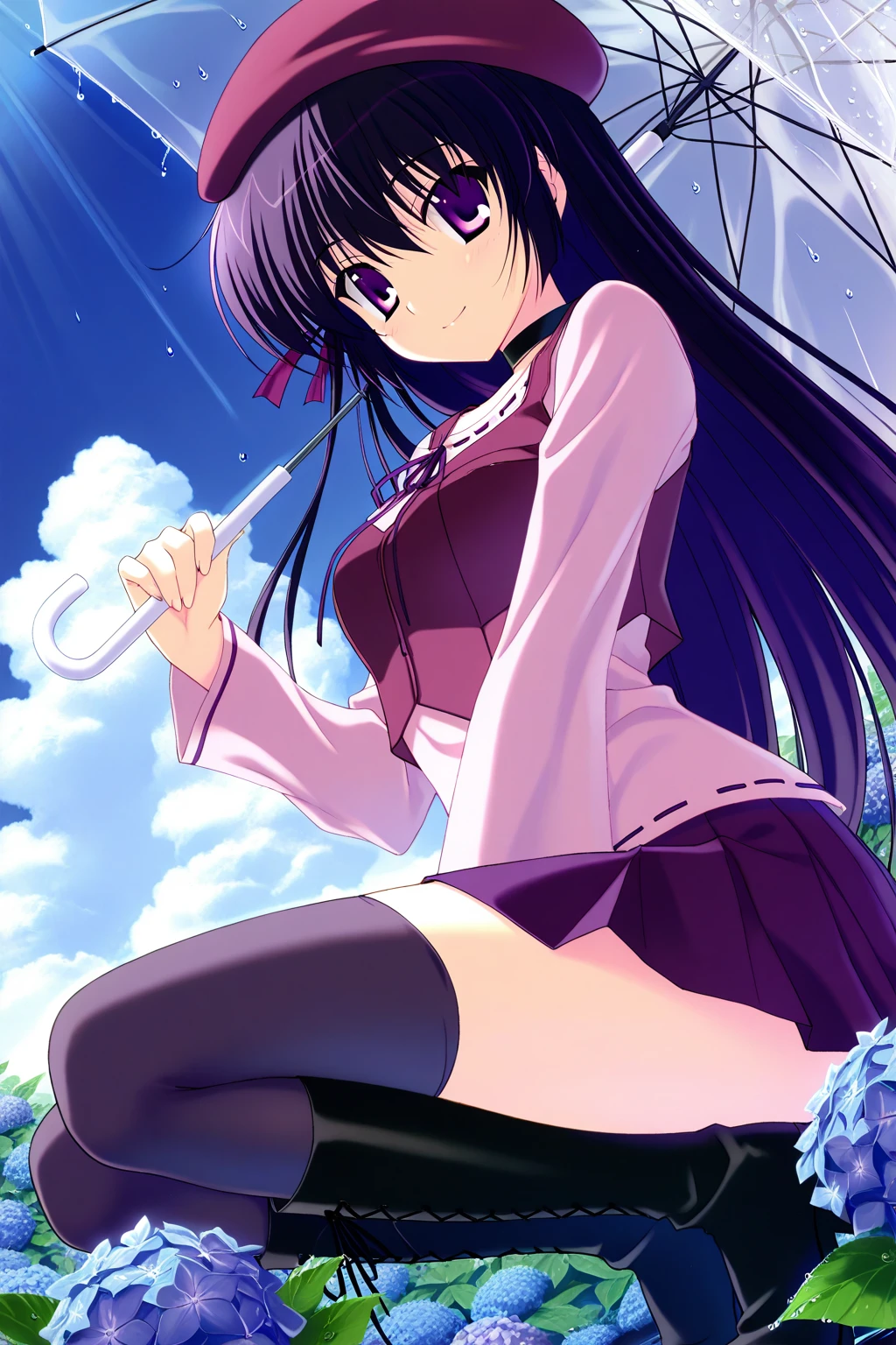 sl_mtr, 1girl, solo, purple eyes, black hair, long hair, medium breasts, red beret, purple hair ribbon, black choker, purple cropped vest, pink shirt, long sleeves, purple neck ribbon, purple skirt, black thighhighs, black boots,