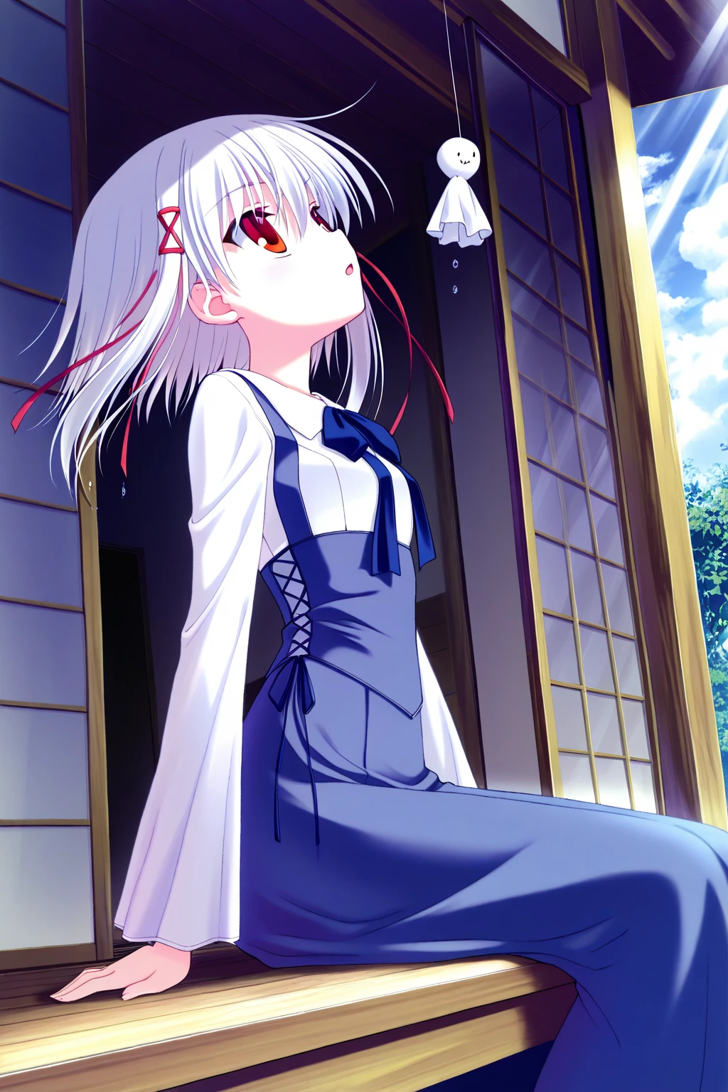 sl_an, 1girl, solo, red eyes, white hair, short hair, hair flaps, small breasts, red hair ribbon, white shirt, long sleeves, blue neck ribbon, blue dress, long dress, layered dress, black boots,