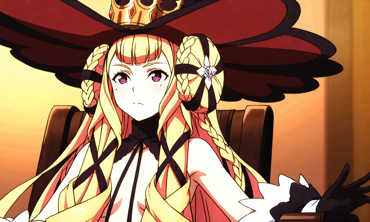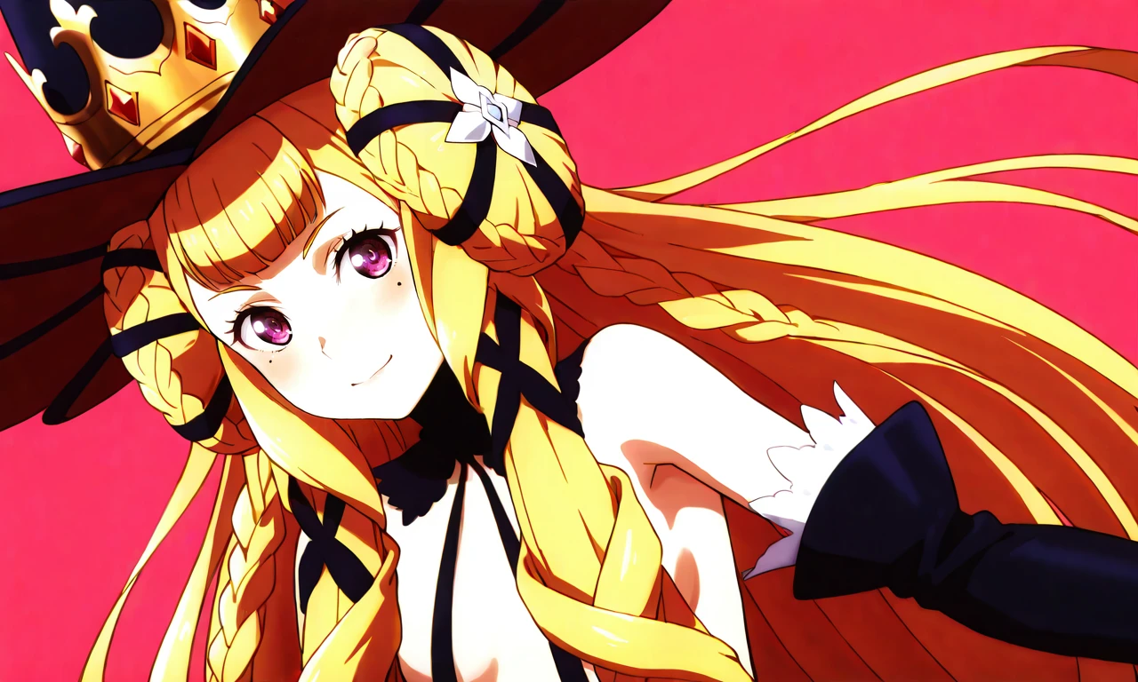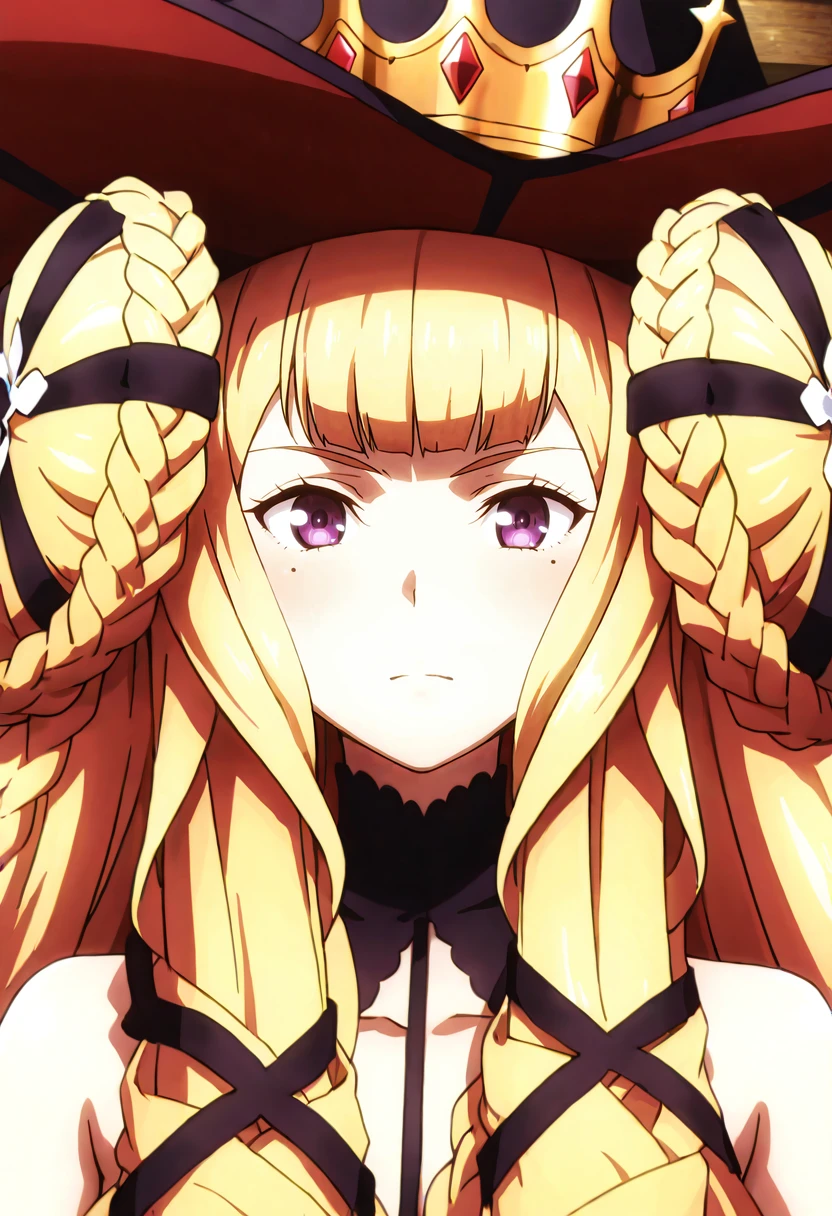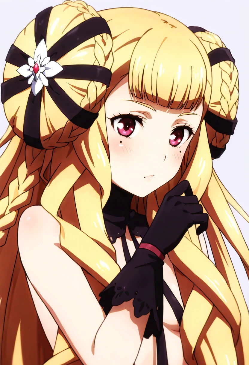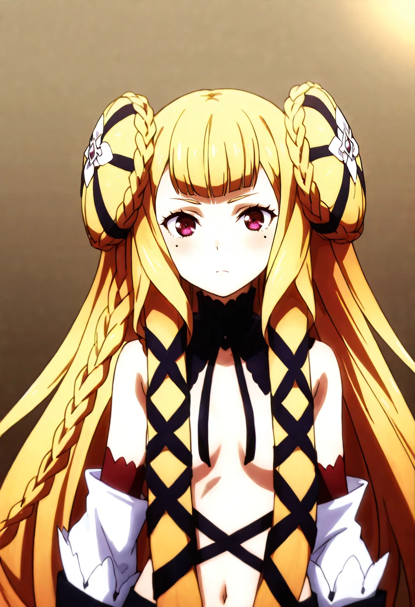 1girl,solo,blonde hair,long hair,very long hair,hair bun,double bun,braided bun,twin braids,multiple braids,hair ribbon,hair ornament,purple eyes,mole,mole under each eye,