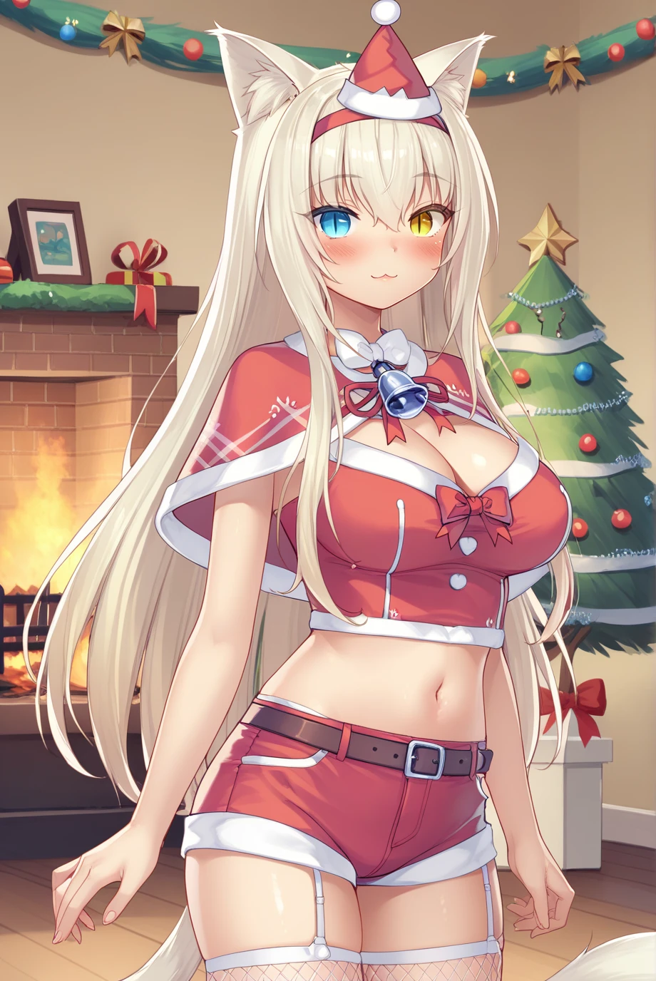 outfit_4, santa costume, santa hat, mini hat, red hairband, neck bell, midriff, red shorts, short shorts, garter straps, fishnets, red footwear, red capelet,Description