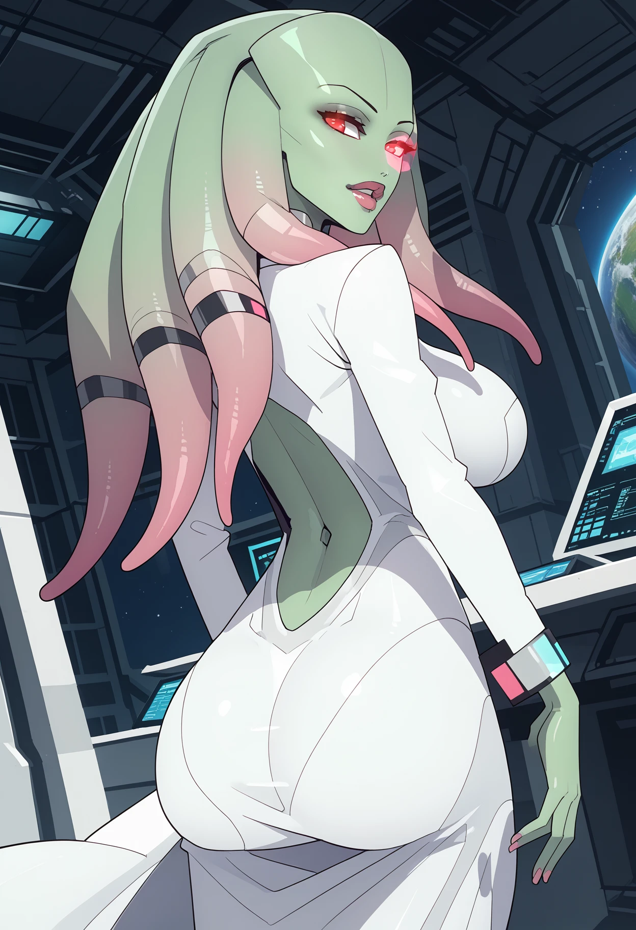 recommended tags: 1girl, solo, alien, monster girl, multicolored skin, colored skin, green skin, glowing eyes, red eyes, gradient hair, pink hair, tentacle hair, breasts, large breasts, lips,