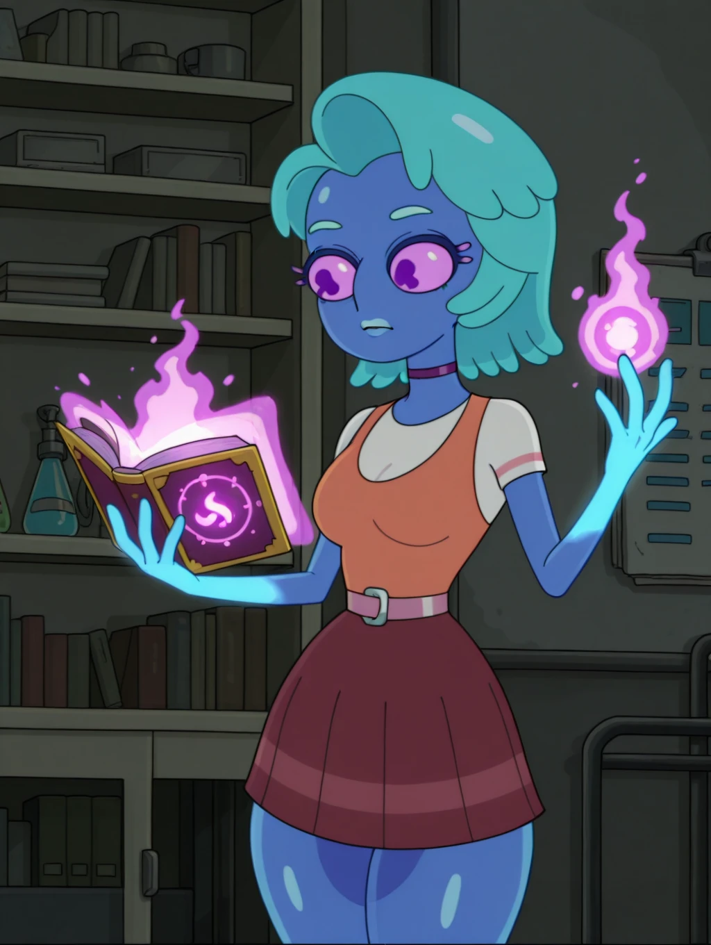 Recommend prompt: " monster girl, solo, purple eyes, aqua hair, blue skin, colored skin, choker "