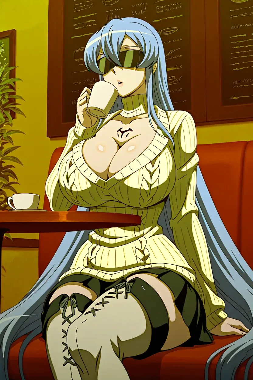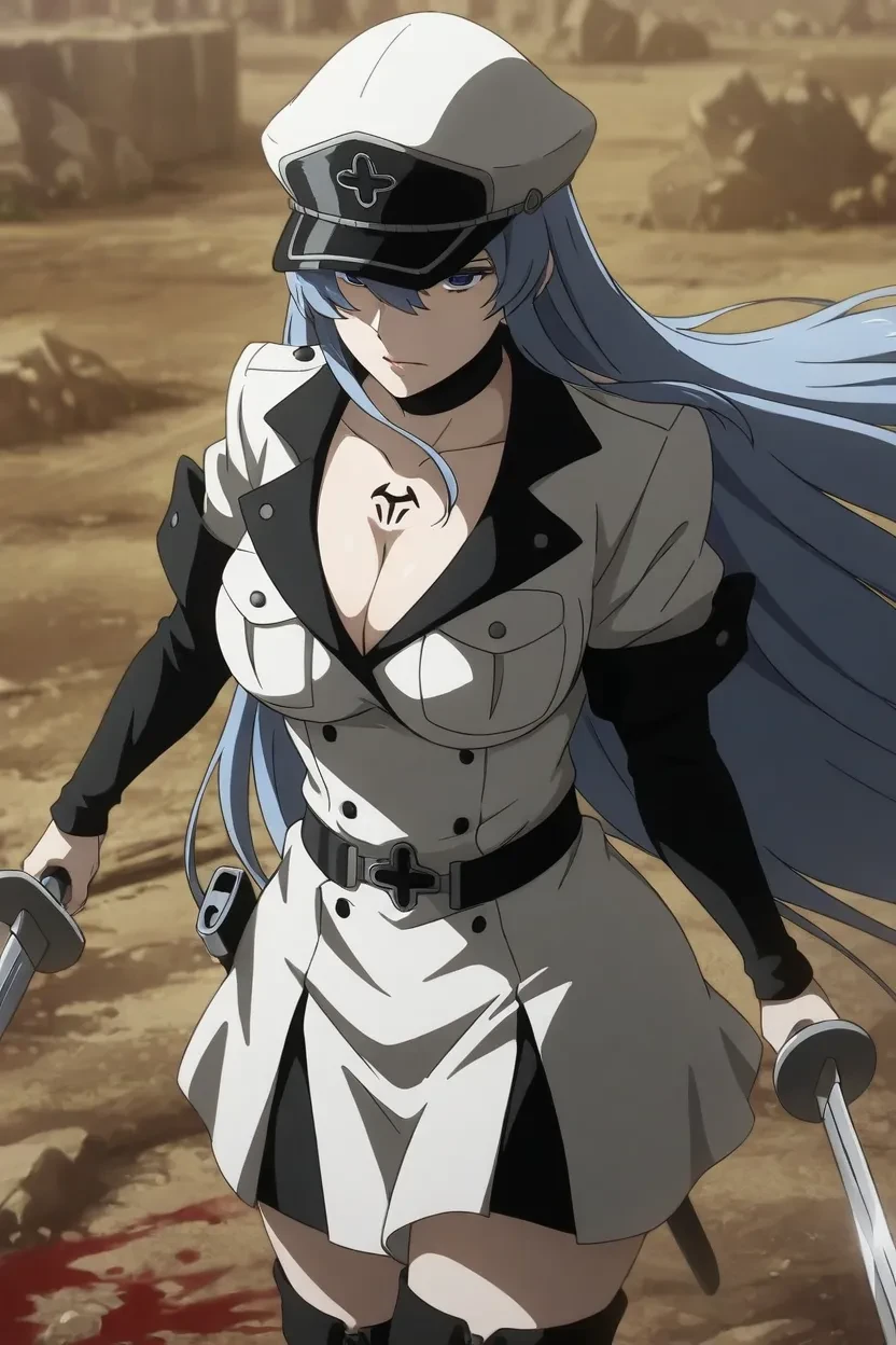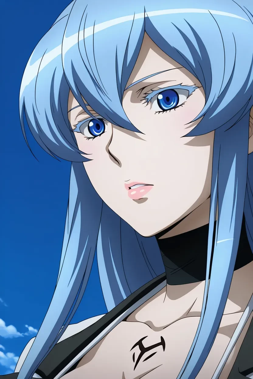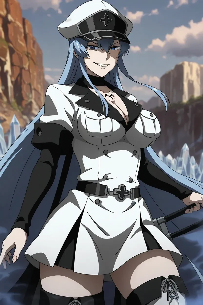 1girl, Esdeath (Akame ga Kill!), blue_eyes, bule_hair, long _hair, lips, thick lips, glossy lips, massive_breasts, Akame_ga_Kill_art_style, HD, 4k, superb quality, high-resolution