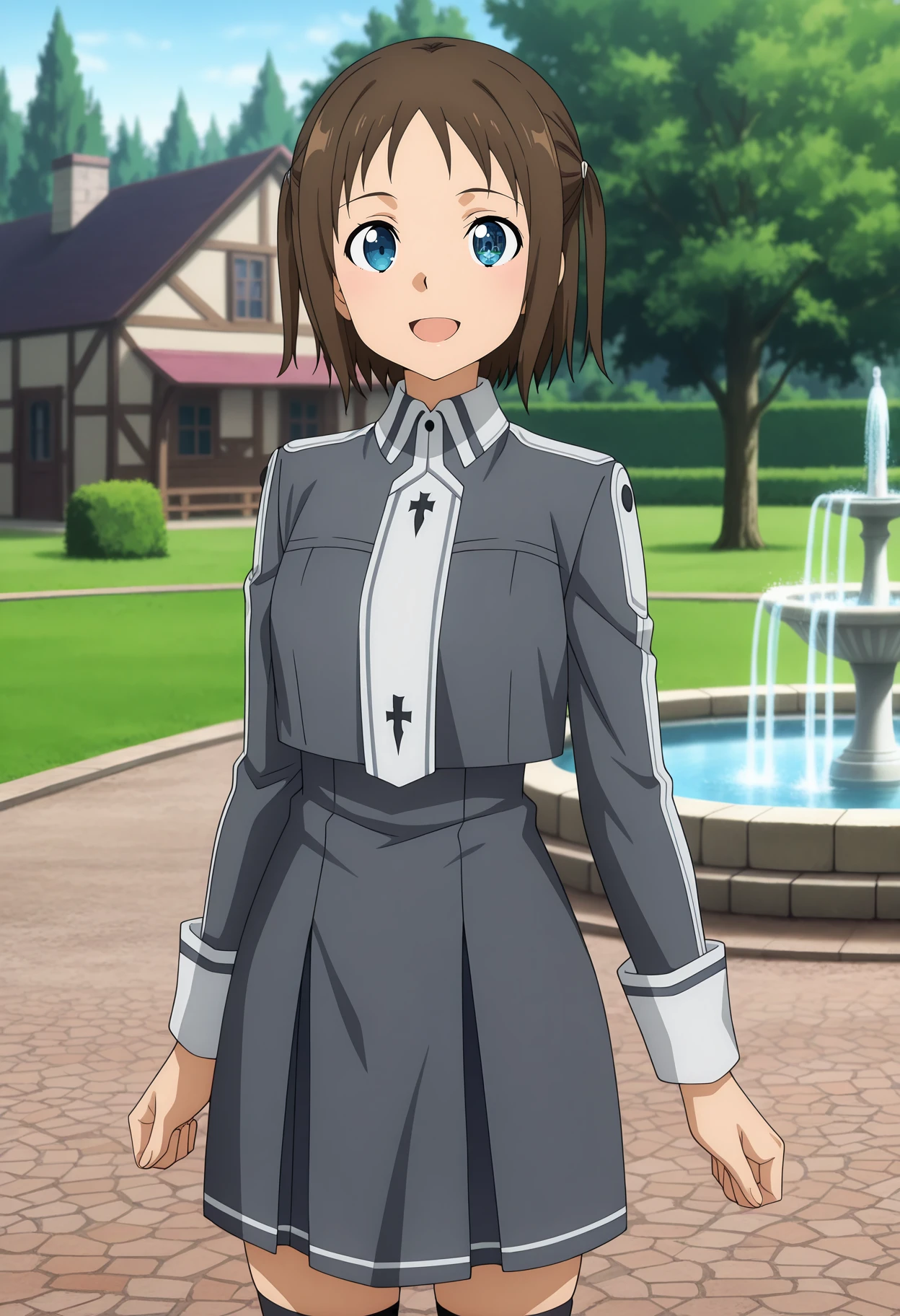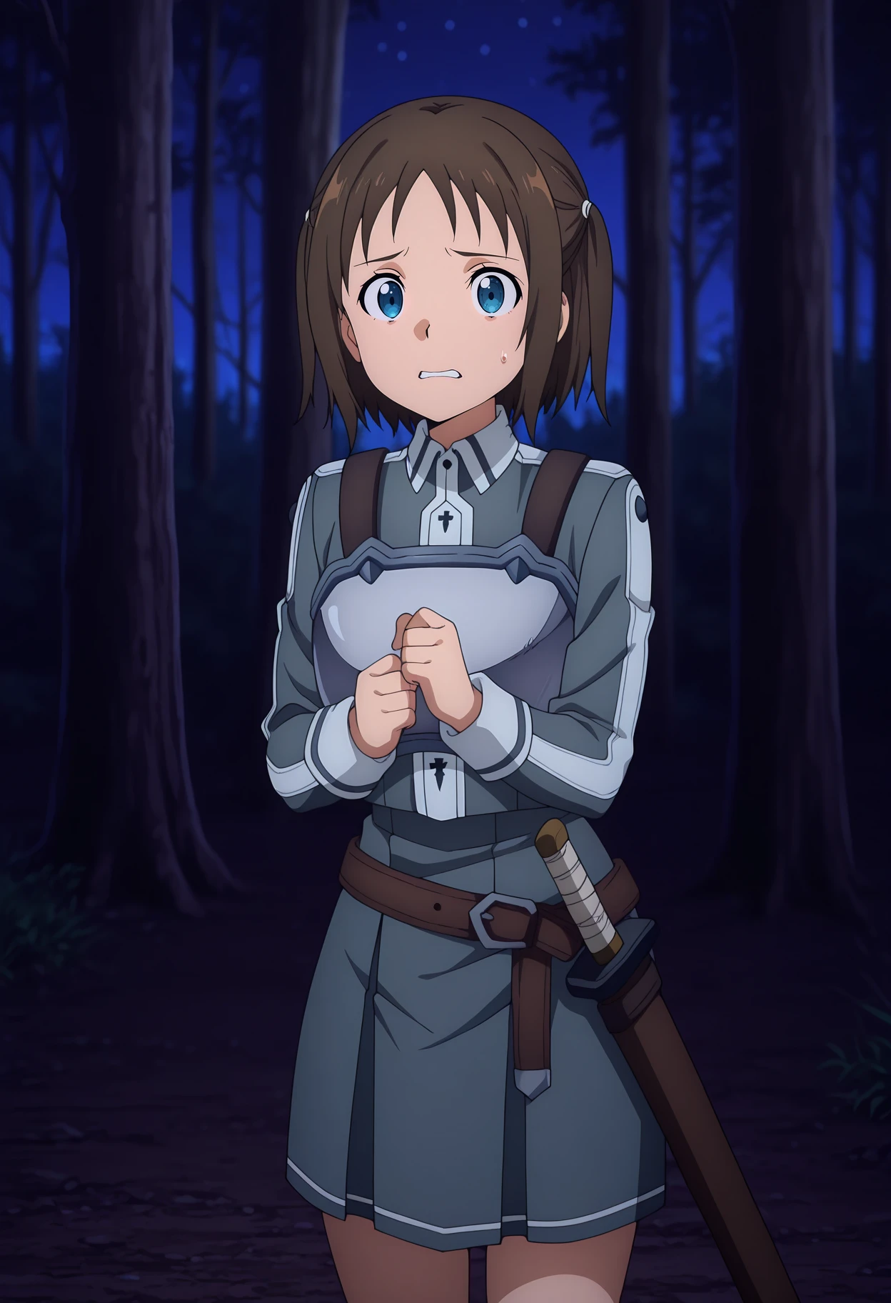 collared jacket, cropped jacket, grey jacket, long sleeves, sleeve cuffs, high-waist skirt, miniskirt, grey skirt, breastplate, brown belt, sheathed