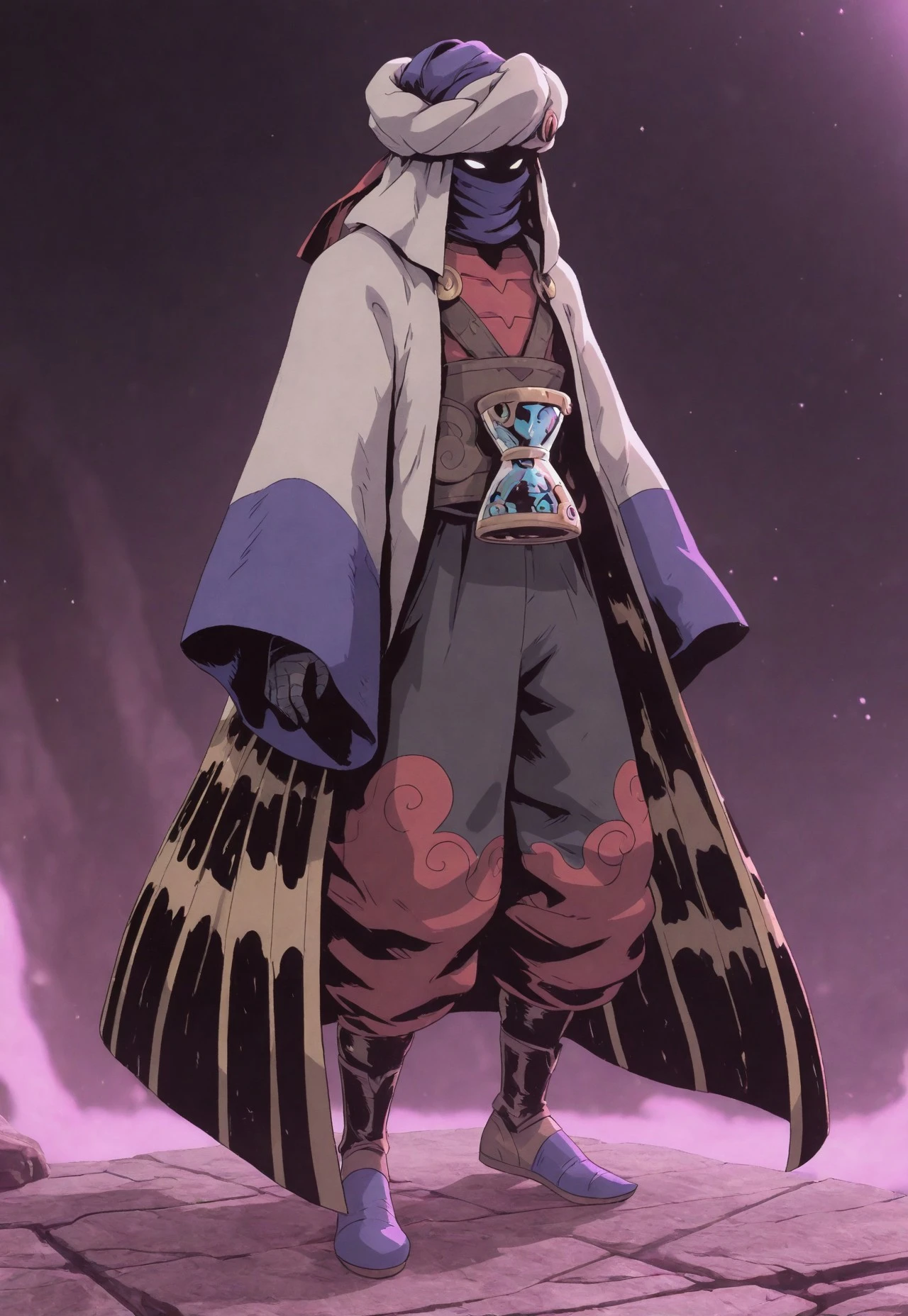 Illustrious tags: resh'an, solo, full body, 1boy, colored skin, turban, faceless, white eyes, cloak, robe, hourglass, bandages, baggy pants, boots