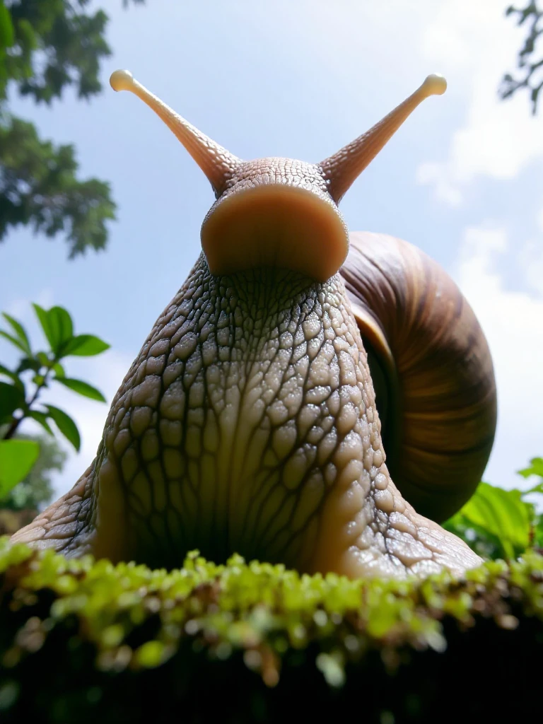 FRT, a snail is sitting on a mossy surface with a leaf and a blurry sky background.