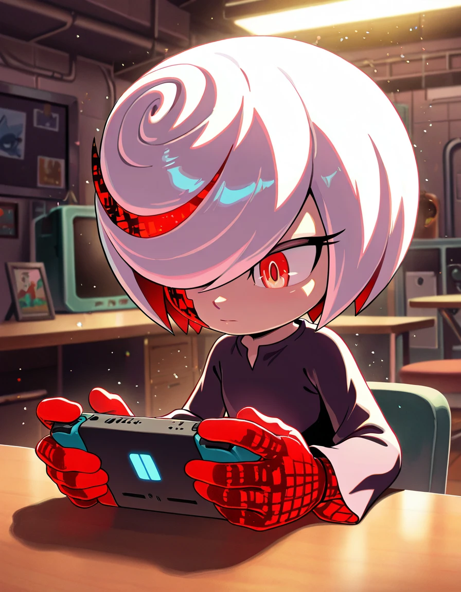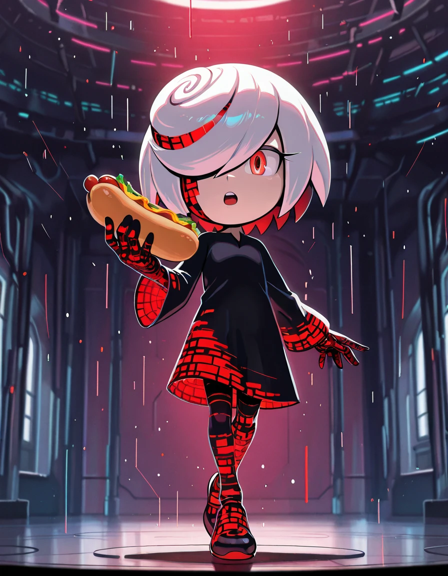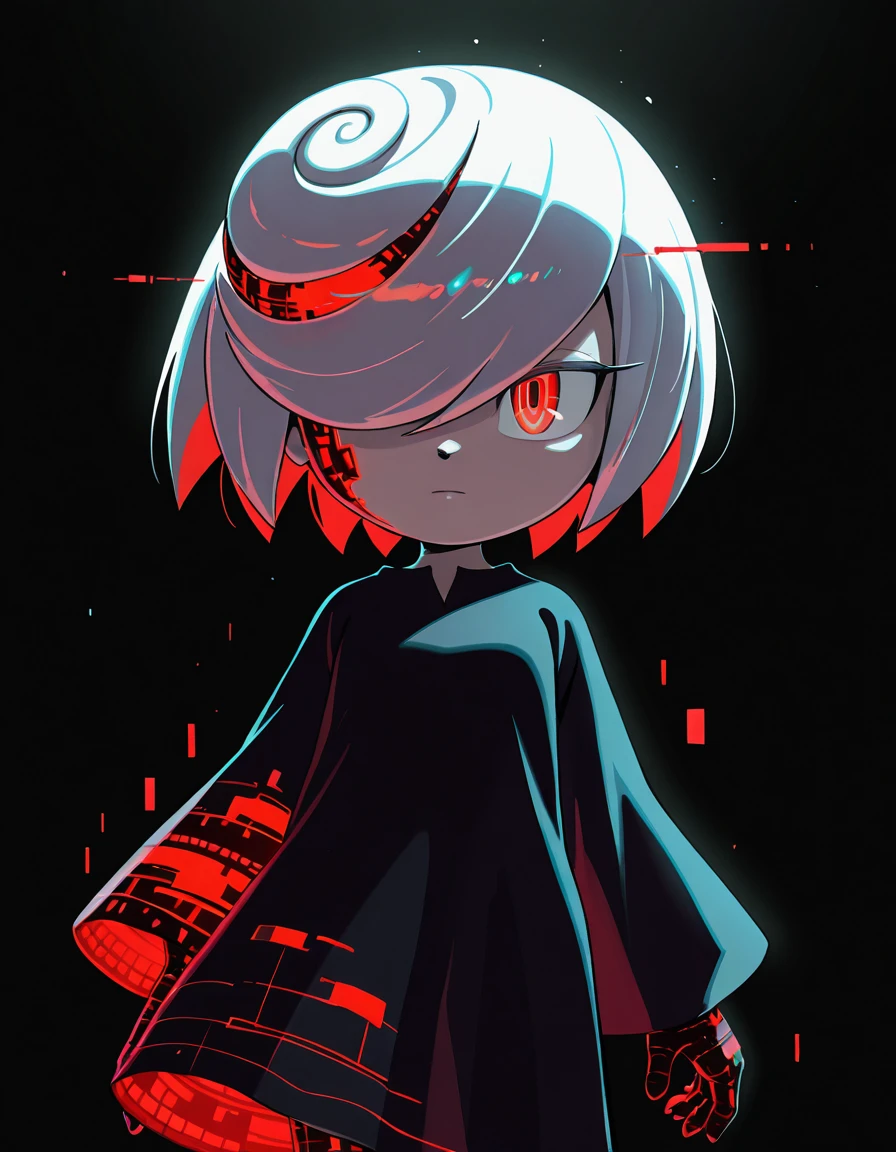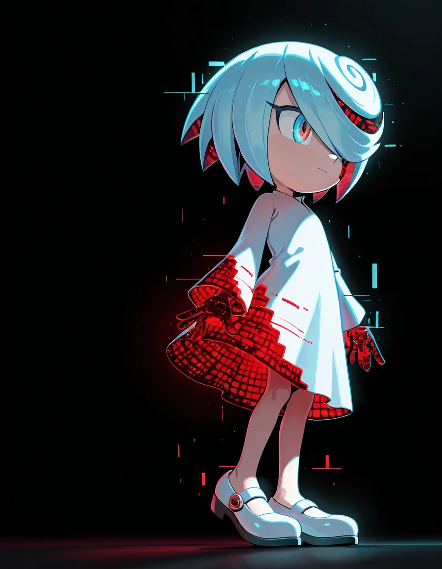 short hair, hair over one eye, white hair, red eyes, glitch, multicolored hair,