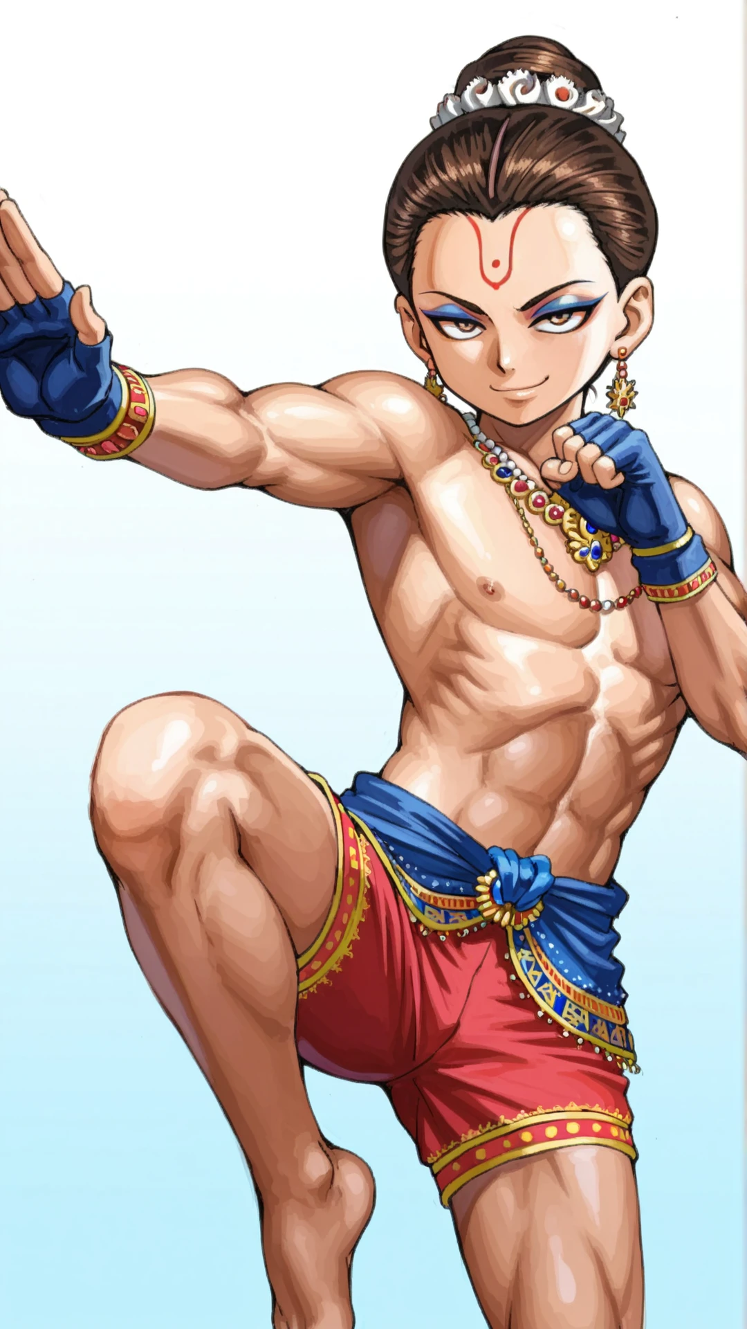 necklace, earrings, makeup, topless male, blue fingerless gloves, red shorts,