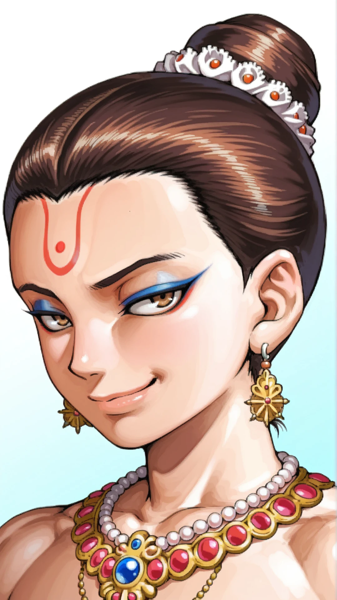 namkiat\(live a live\),brown eyes,eyeshadow, brown hair, single hair bun, forehead mark, male focus,muscular, skinny ,
