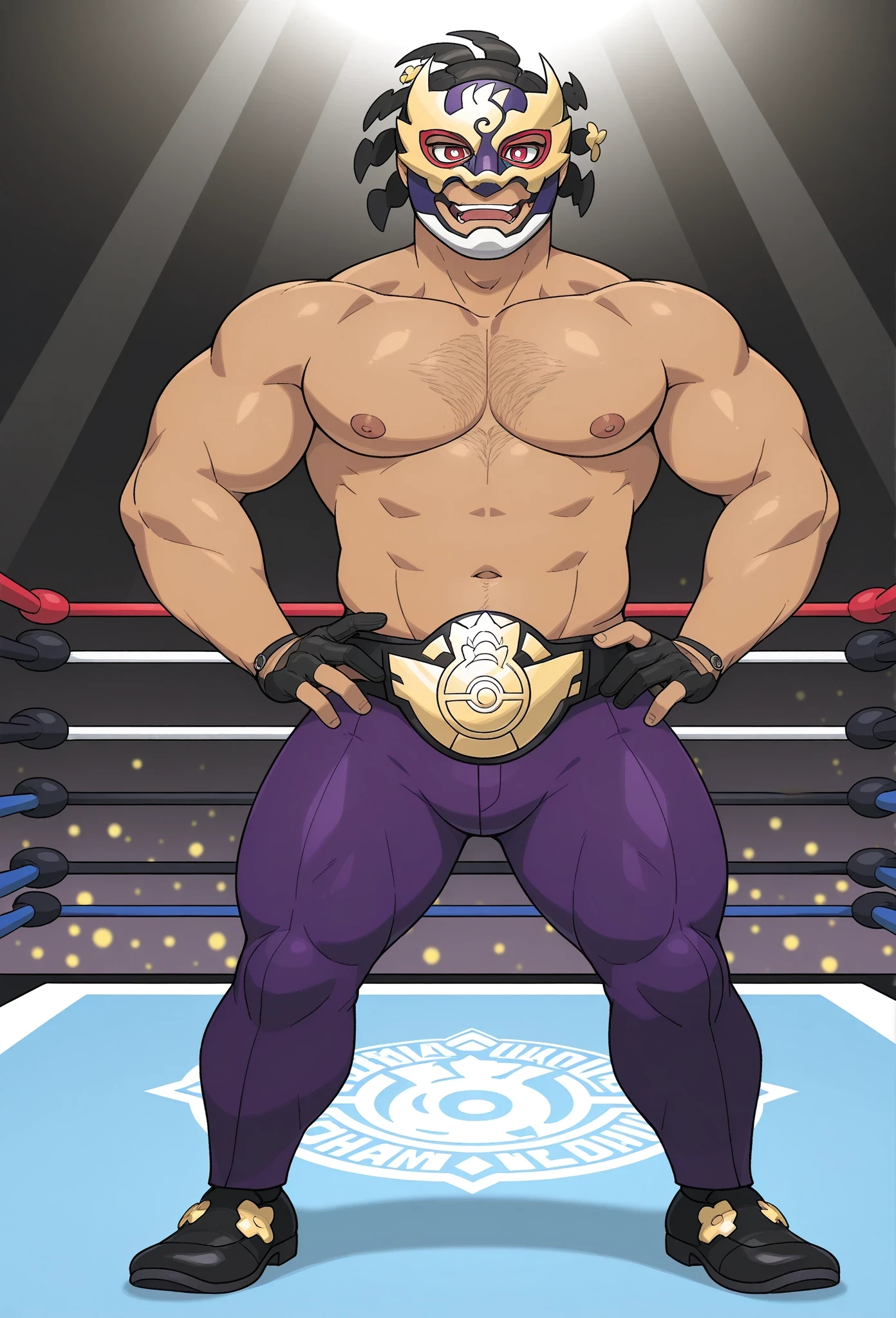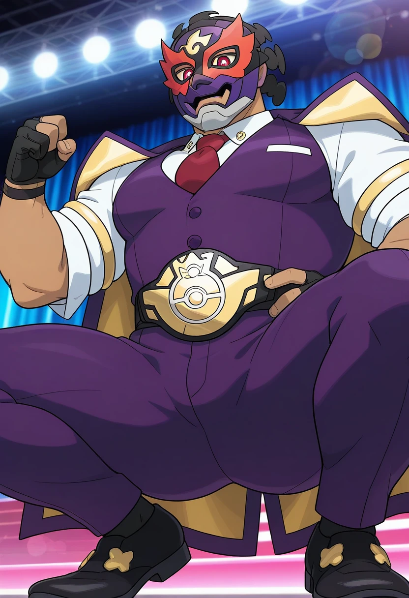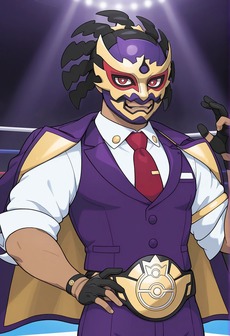 kajimapc, 1boy, solo, red eyes, white pupils, armlet, bara, black gloves, black shoes, championship belt, coat, mask, masked, partially fingerless gloves, purple coat, purple pants, purple vest, red necktie, white shirt, wristband