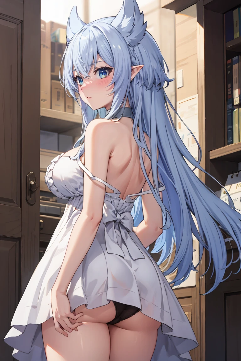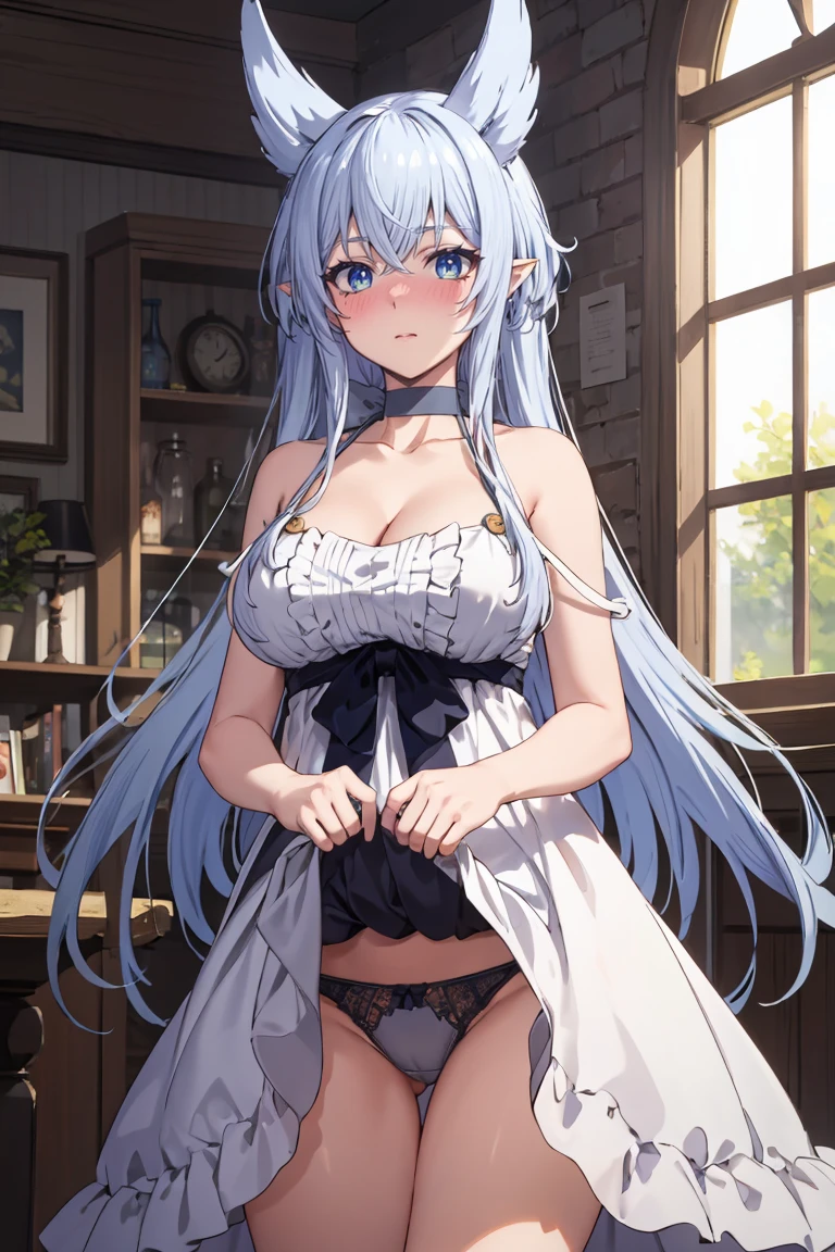 Apperance: fenrys, long hair, blue eyes, hair flaps, pointy ears, large breasts (blue eyes needed because of her lashes. Without this tag under her eyes looks like ruined makeup)