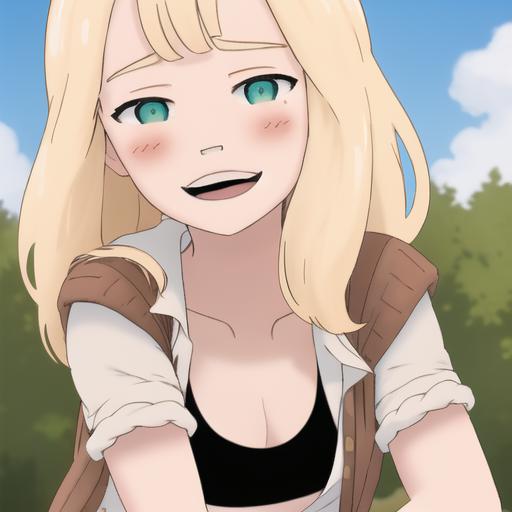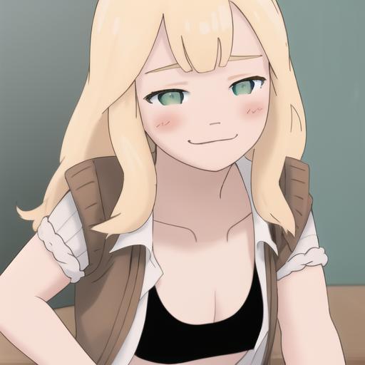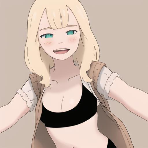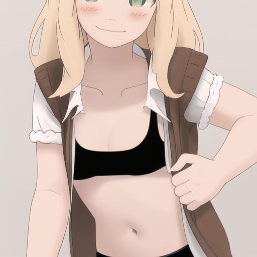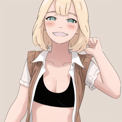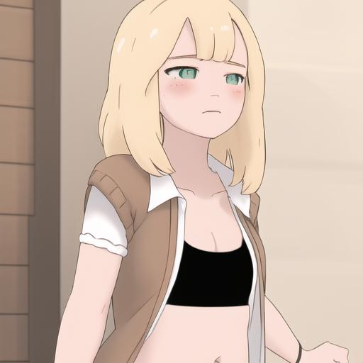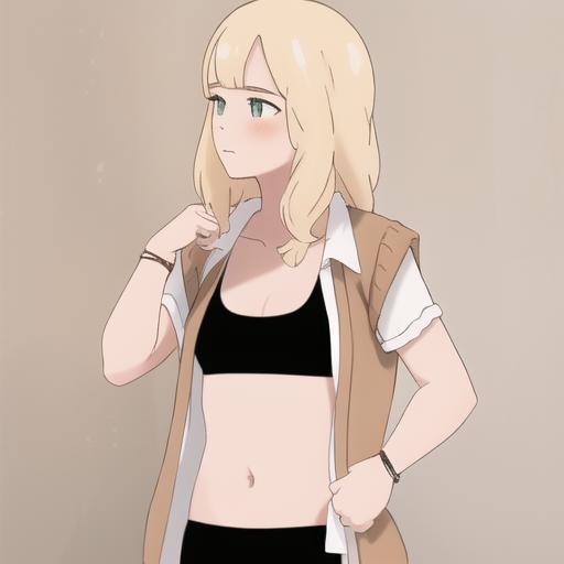 4l3x, blonde, green eyes, brown sweater, white short sleeves, open clothes, black sports bra