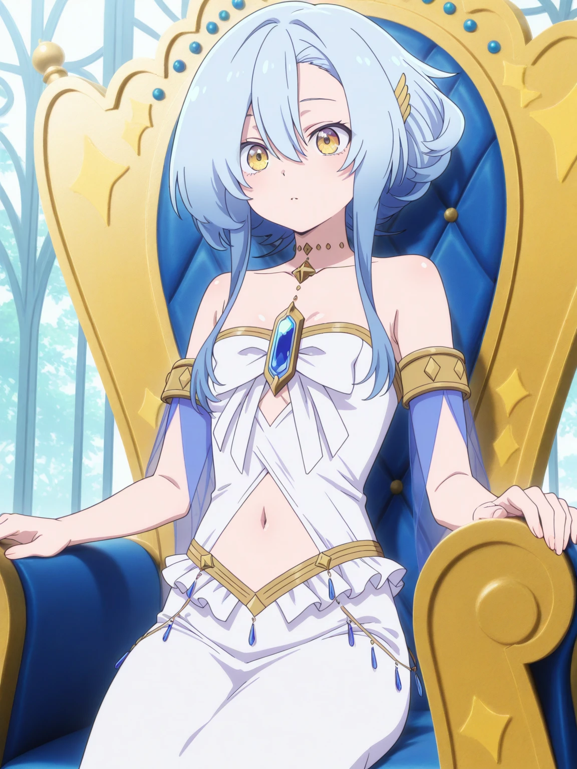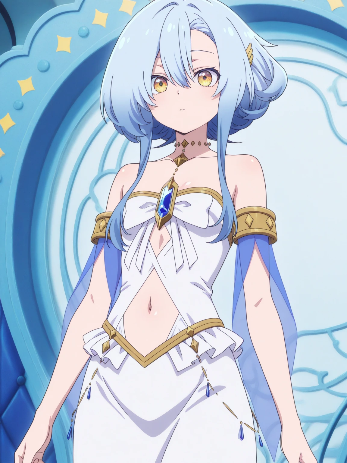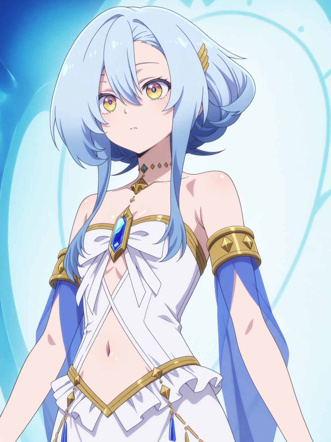 Character: (MegamiSama, yellow eyes, blue hair, short hair with long locks, hair ornament)